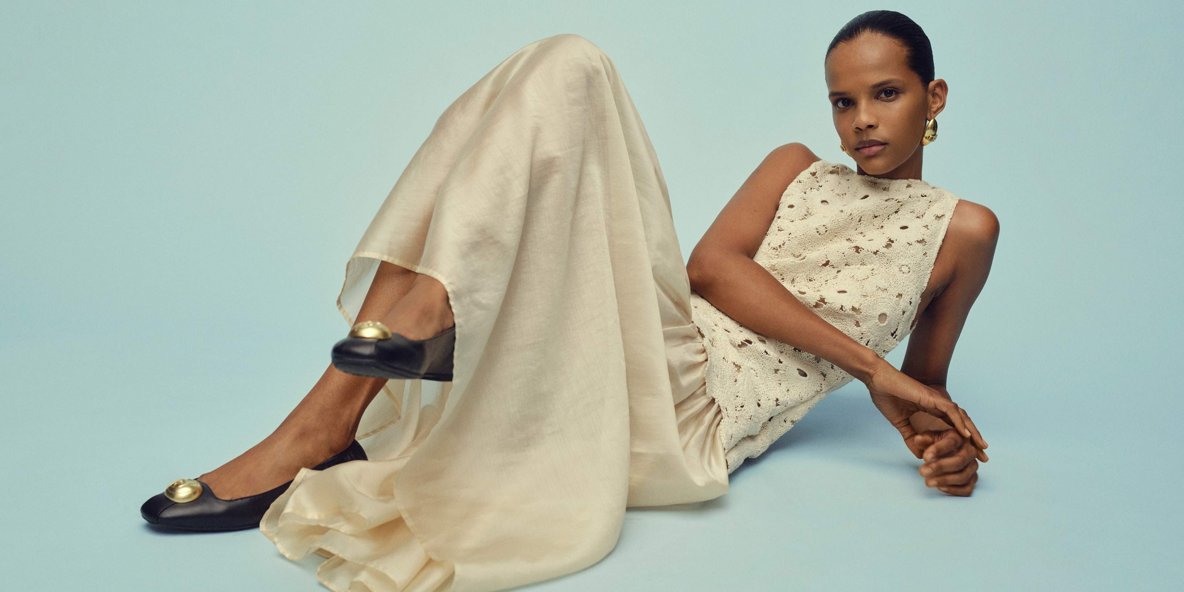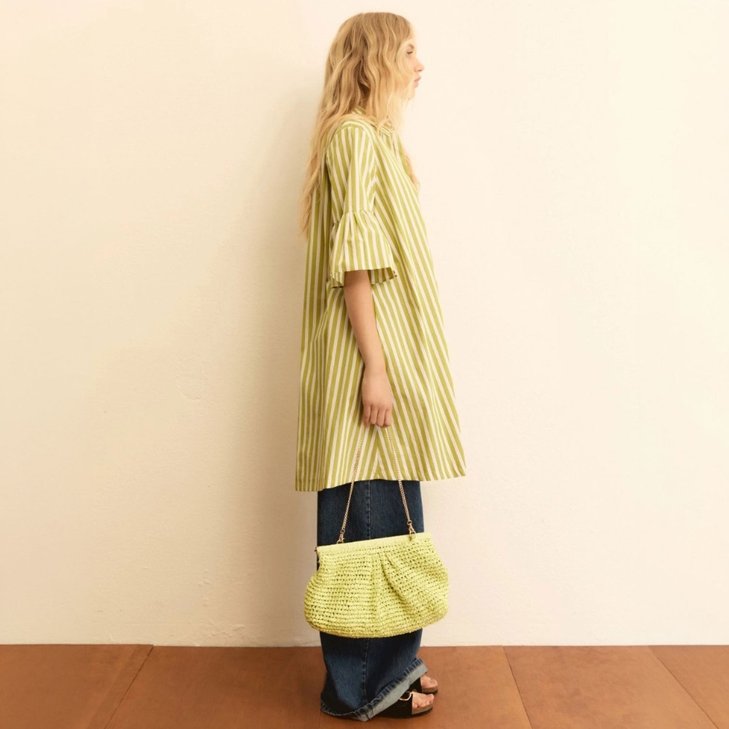 Quando la temperatura sale, lo stile diventa leggero: come questo abito in popeline, con collo a polo per una nota informale e il tocco romantico delle balze alle maniche.