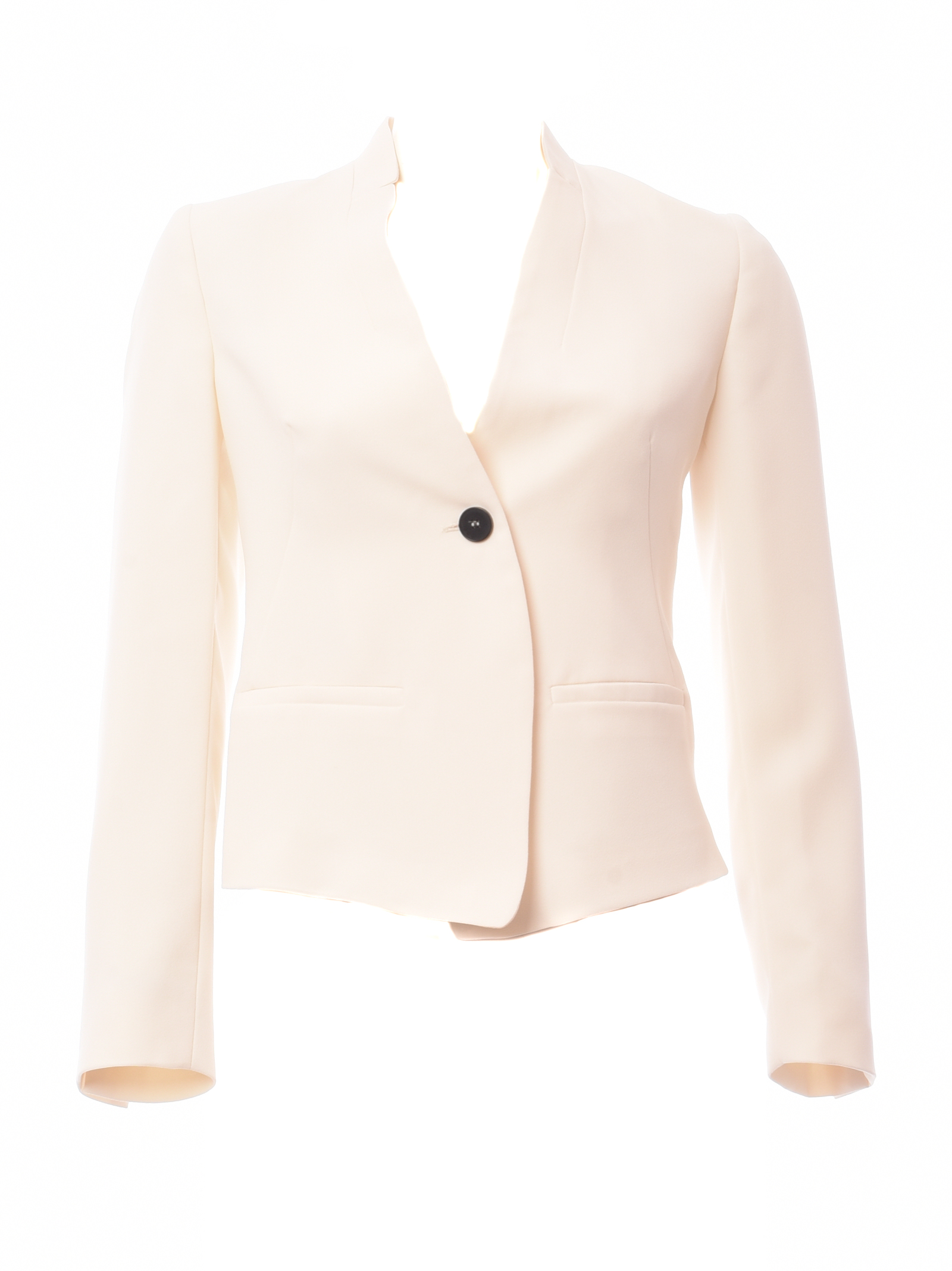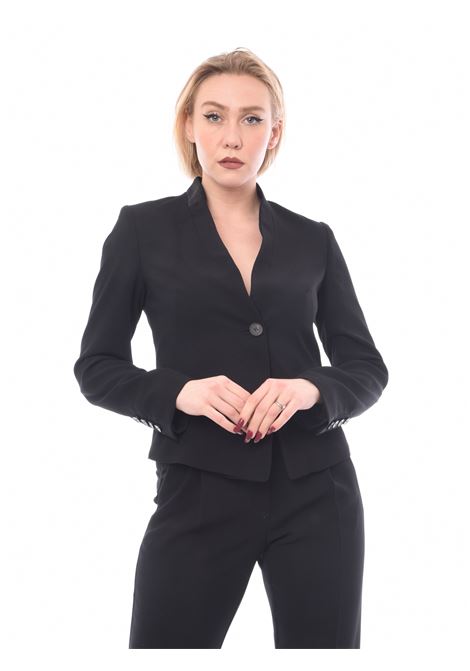 Tailleur made of Semi-fitted crepe envers satin blazer. Long sleeves, welt pockets and a resin button fastening. Lined model and matching trousers.