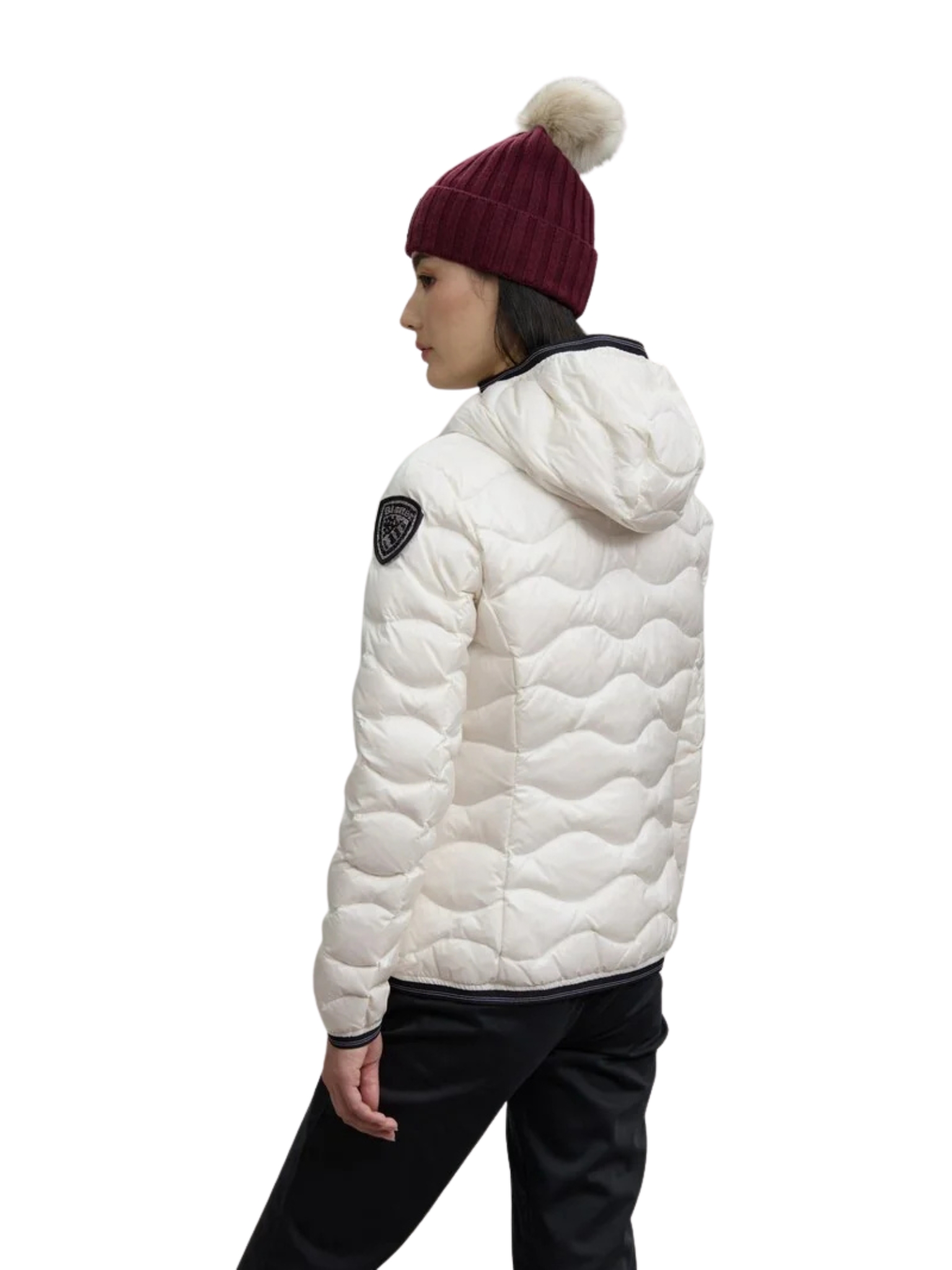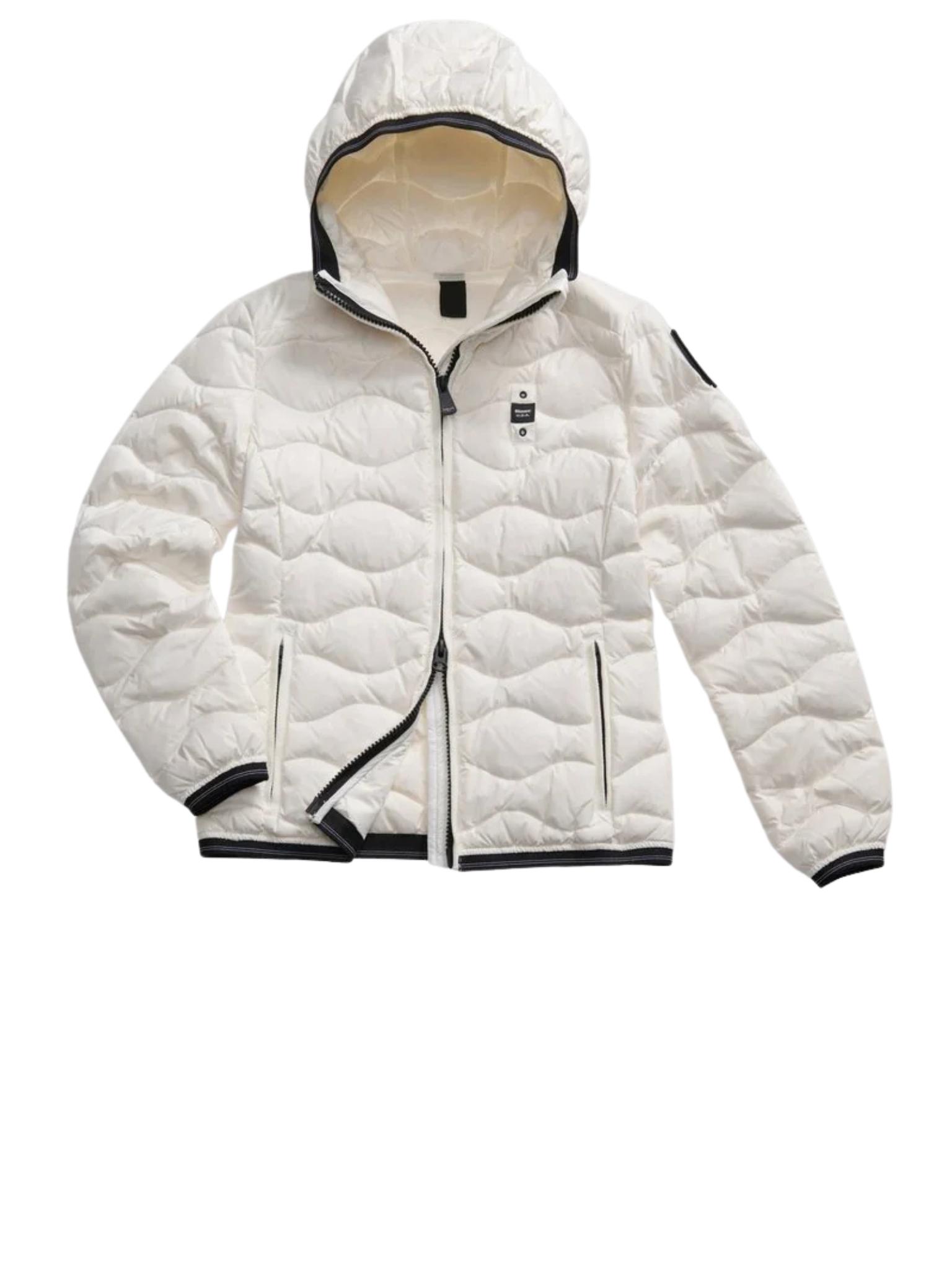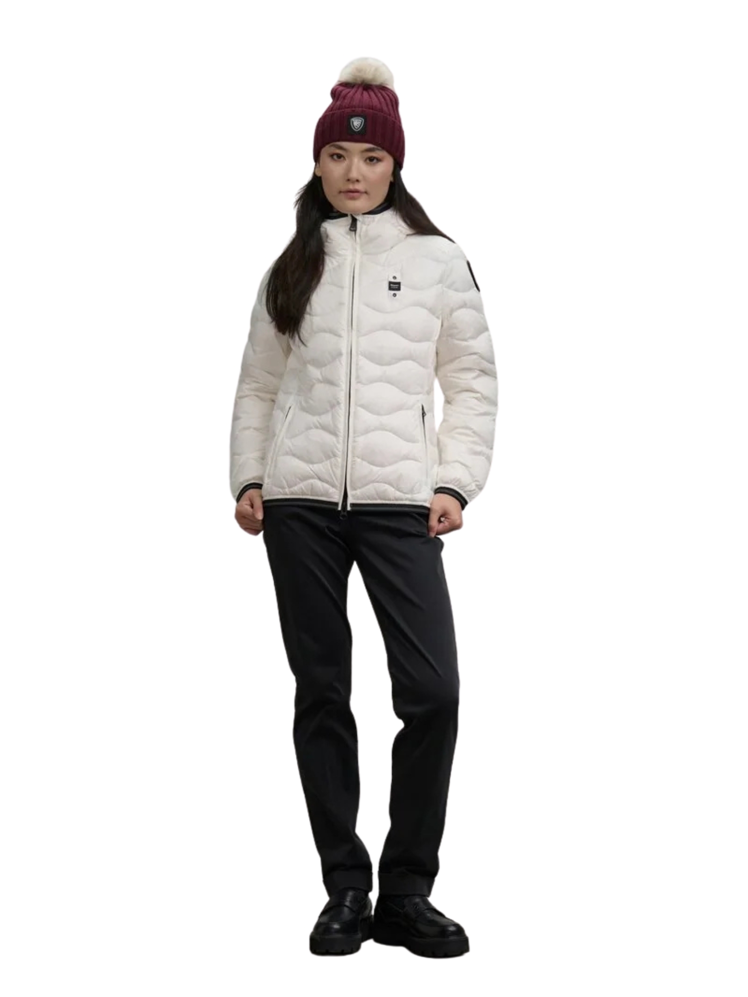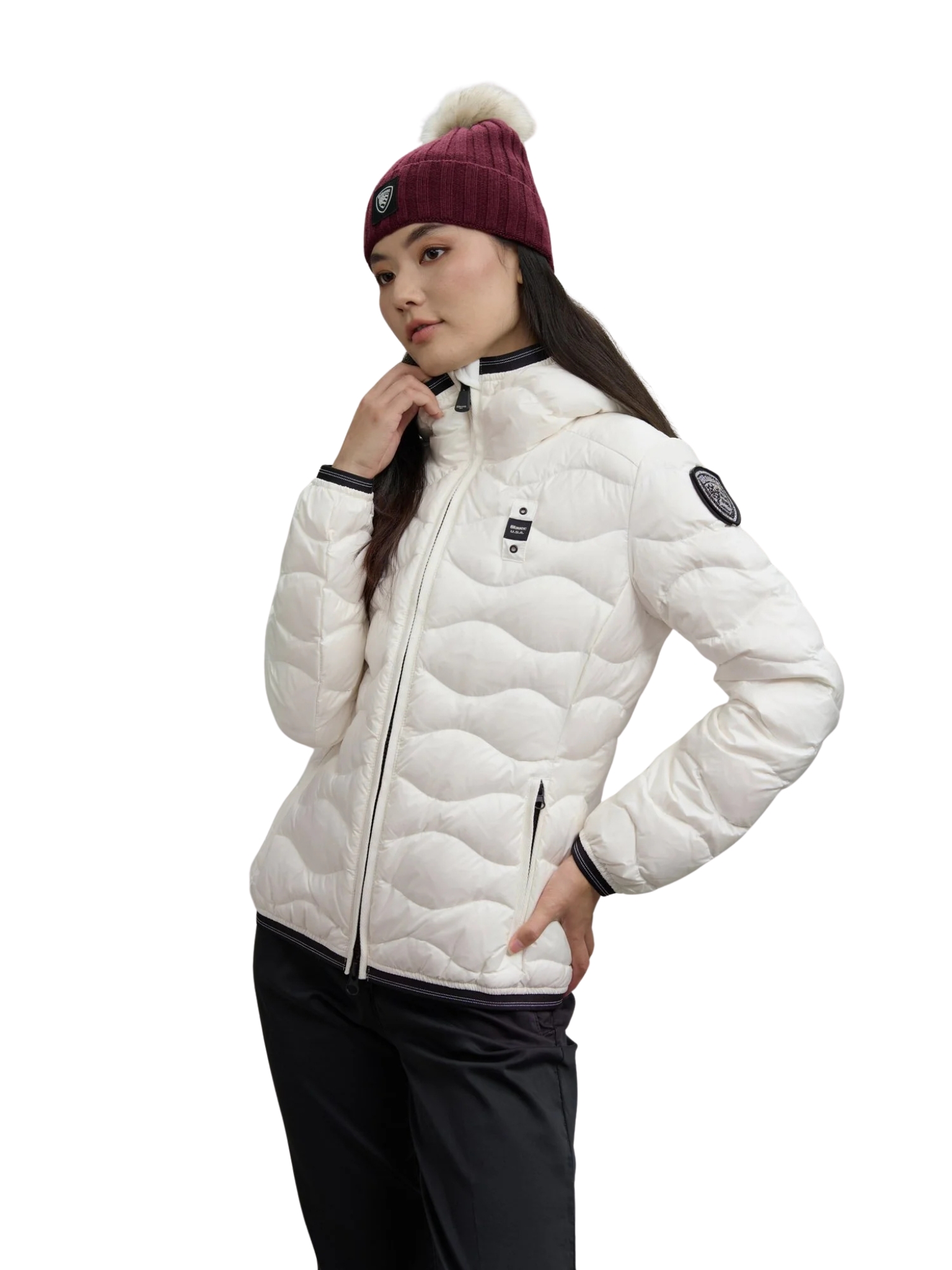 Piumino idrorepellente trapuntato ad onde orizzontali dal taglio svasato. Capo iconico Blauer con imbottitura naturale, calda e non ingombrante.