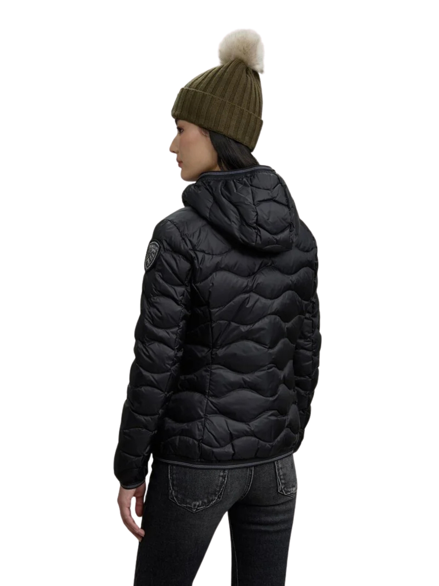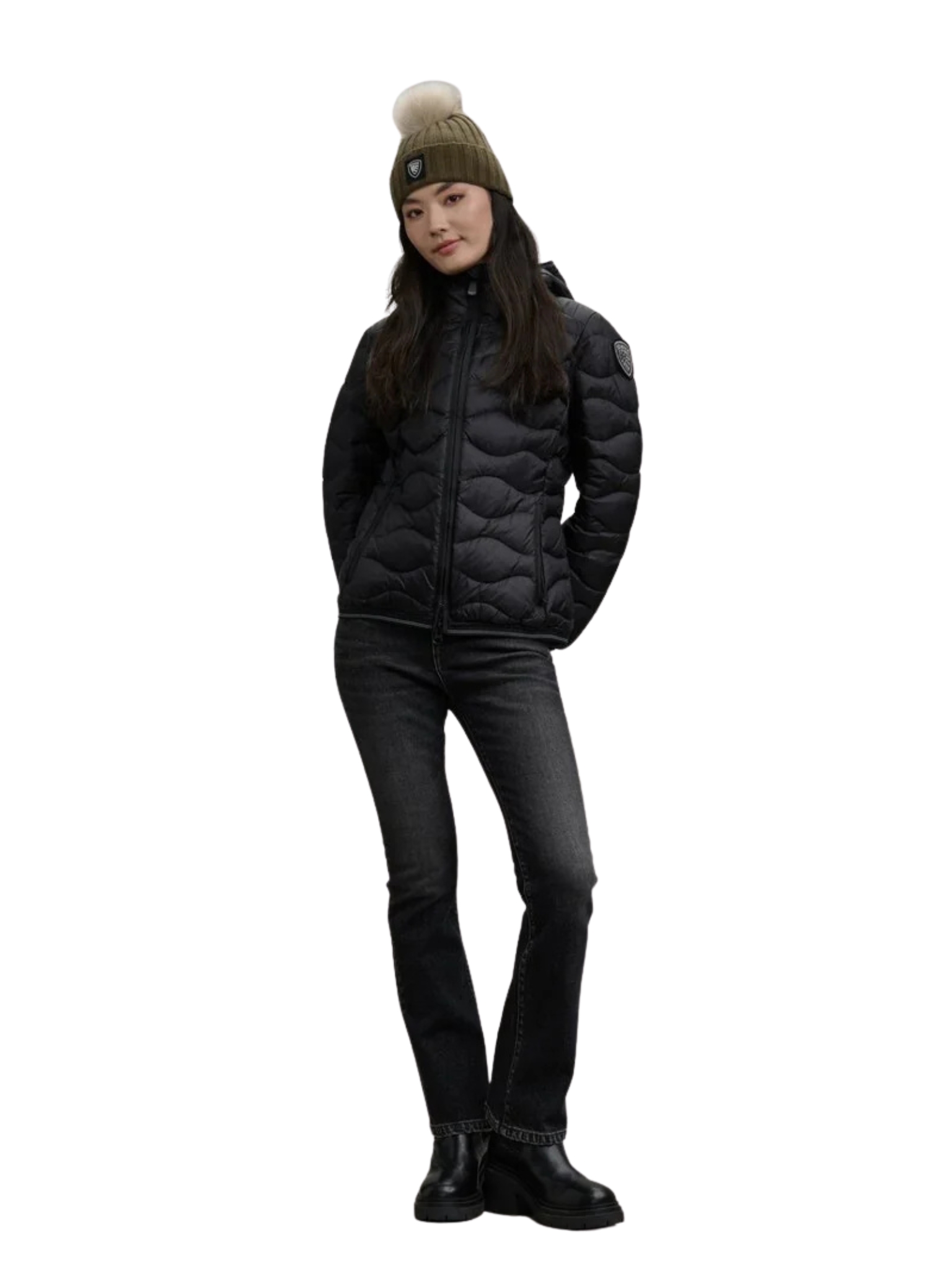 Piumino idrorepellente trapuntato ad onde orizzontali dal taglio svasato. Capo iconico Blauer con imbottitura naturale, calda e non ingombrante.