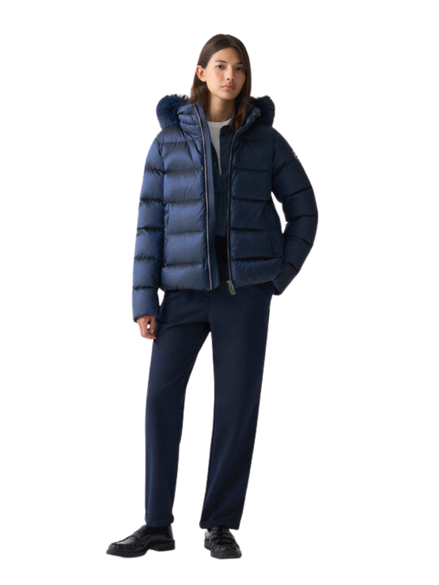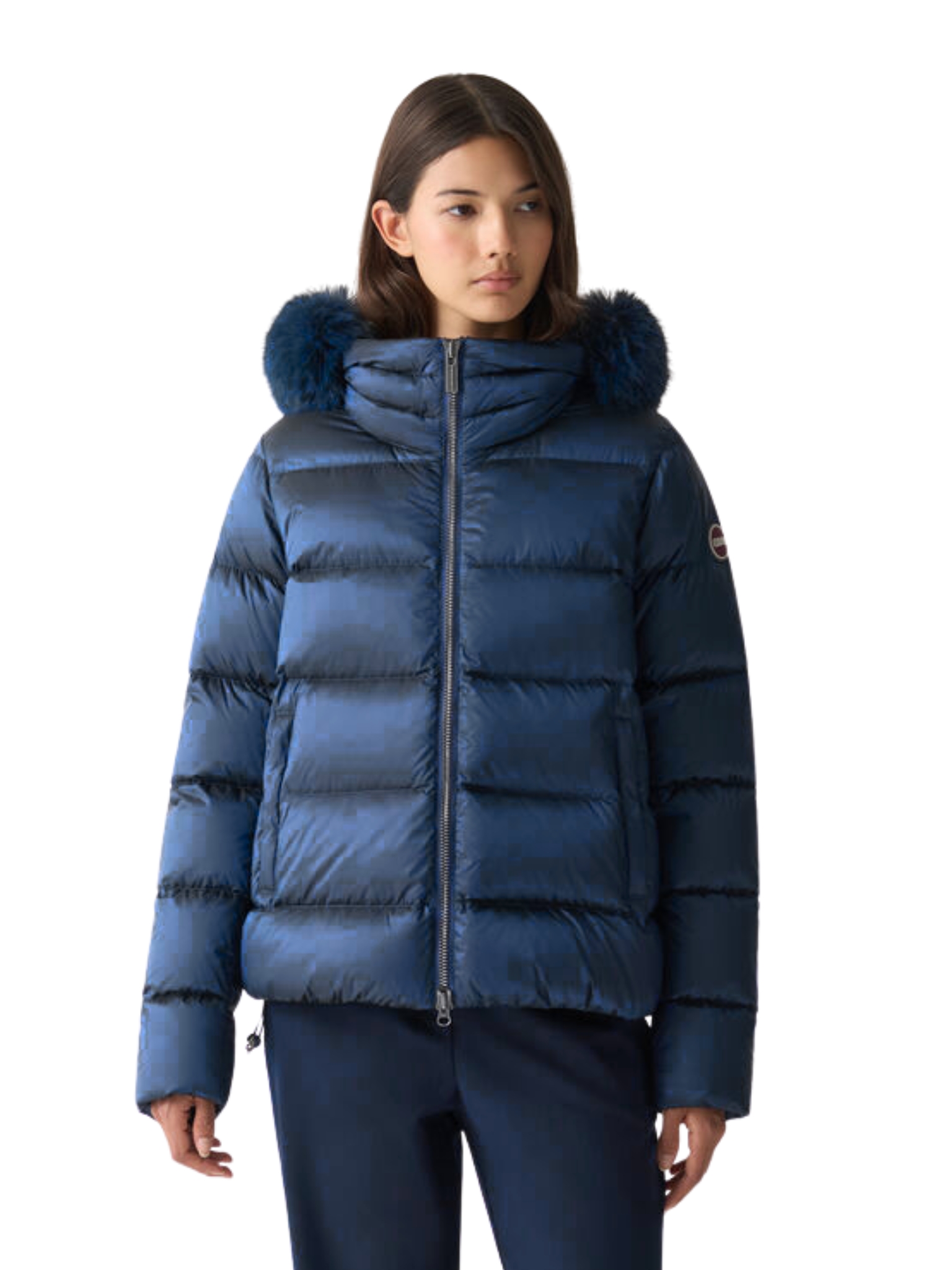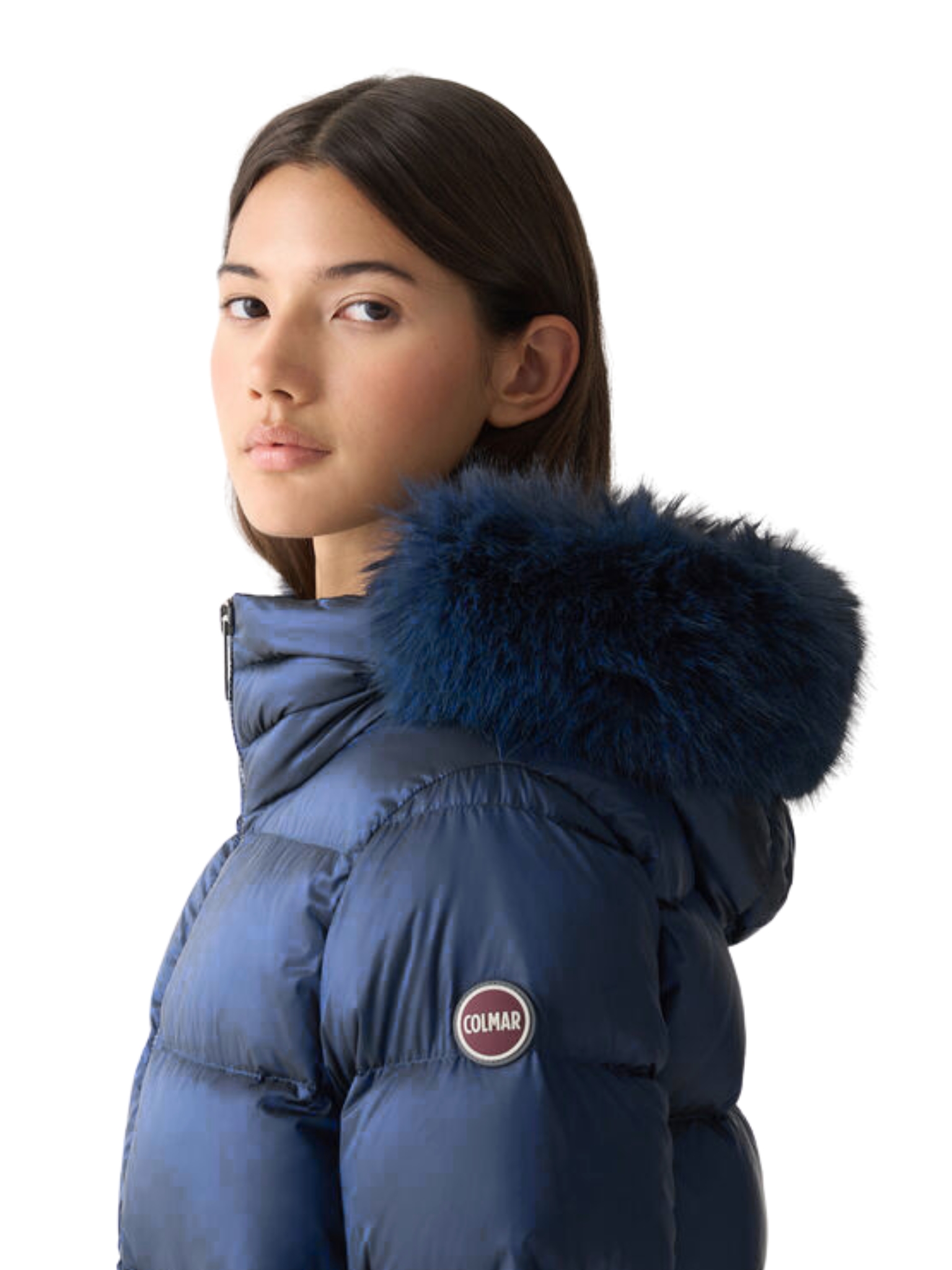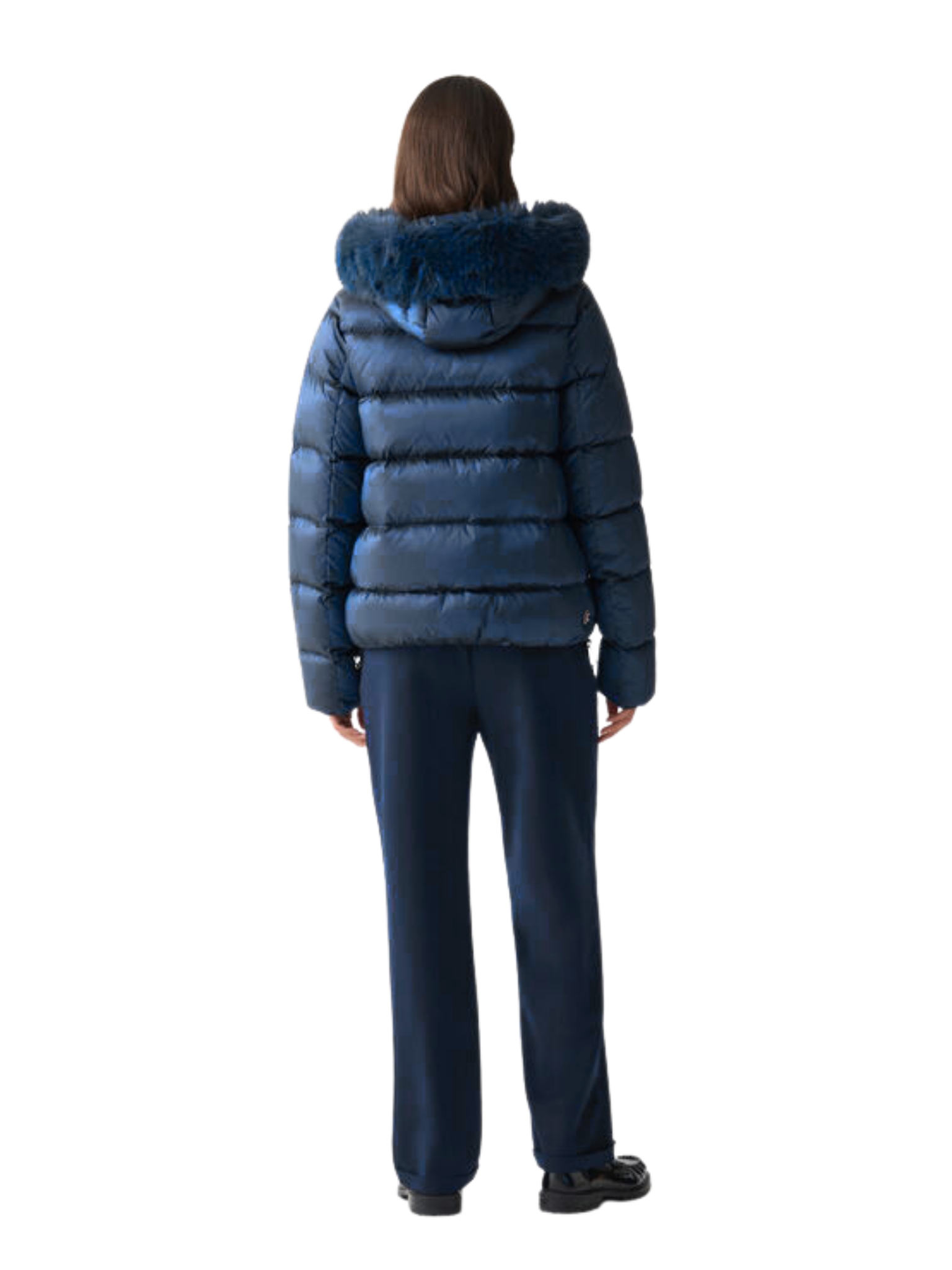 Il cappuccio orlato in pelliccia sintetica, unito al filato che crea una gamma di colori cangianti, fa di questo piumino un vero e proprio simbolo di femminilità. Il collo alto assicura massima protezione dal freddo, mentre le tasche laterali e il fondo regolabile offrono comfort e funzionalità