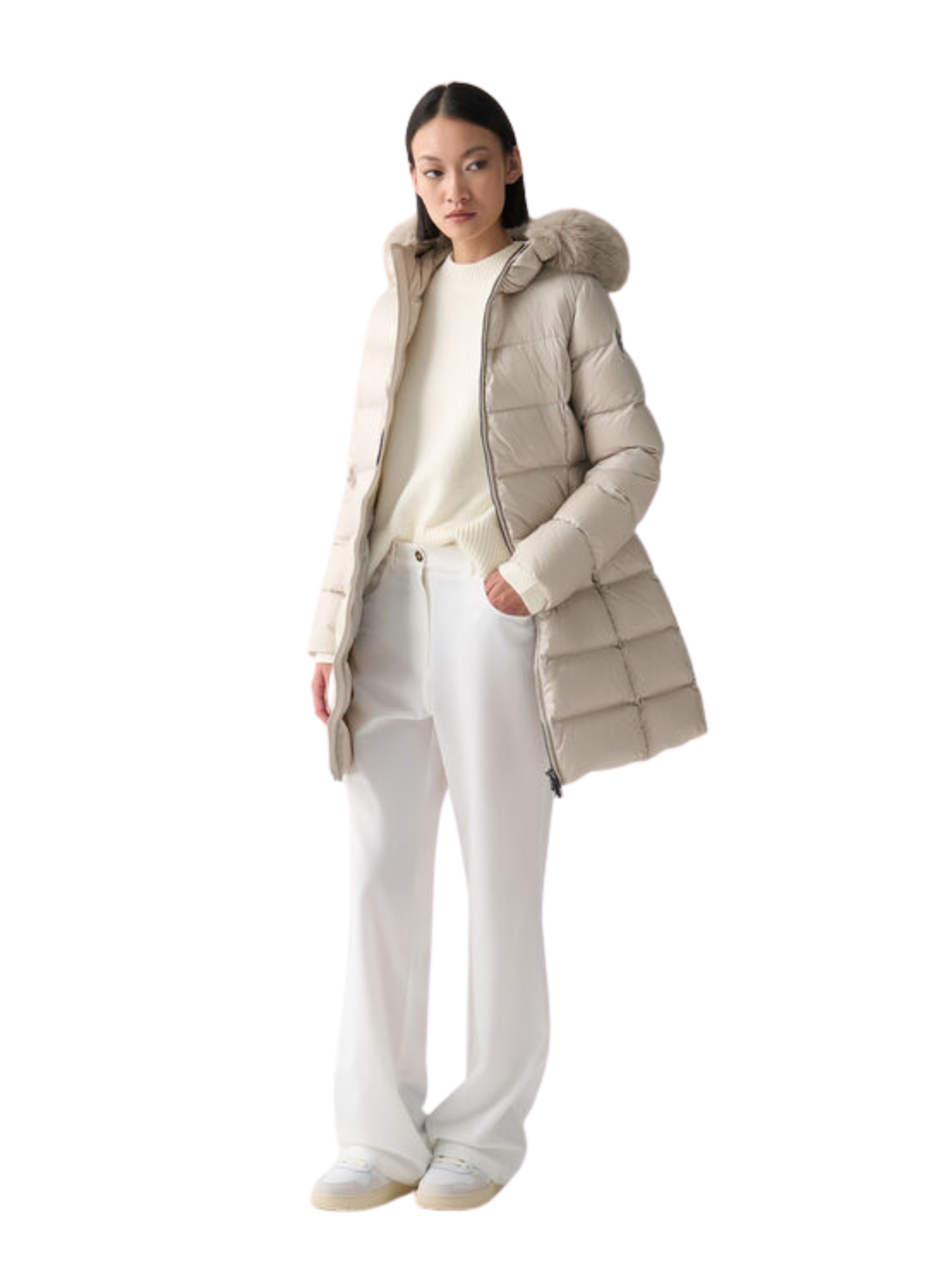 Questo piumino da donna offre calore senza rinunciare allo stile. Il cappuccio in pelliccia sintetica e le tasche laterali aggiungono un tocco sofisticato, mentre il taglio medio lungo e avvitato esalta la silhouette. Il collo avvolgente garantisce una protezione extra dal freddo, rendendolo l'alleato perfetto per affrontare la stagione con classe e praticità