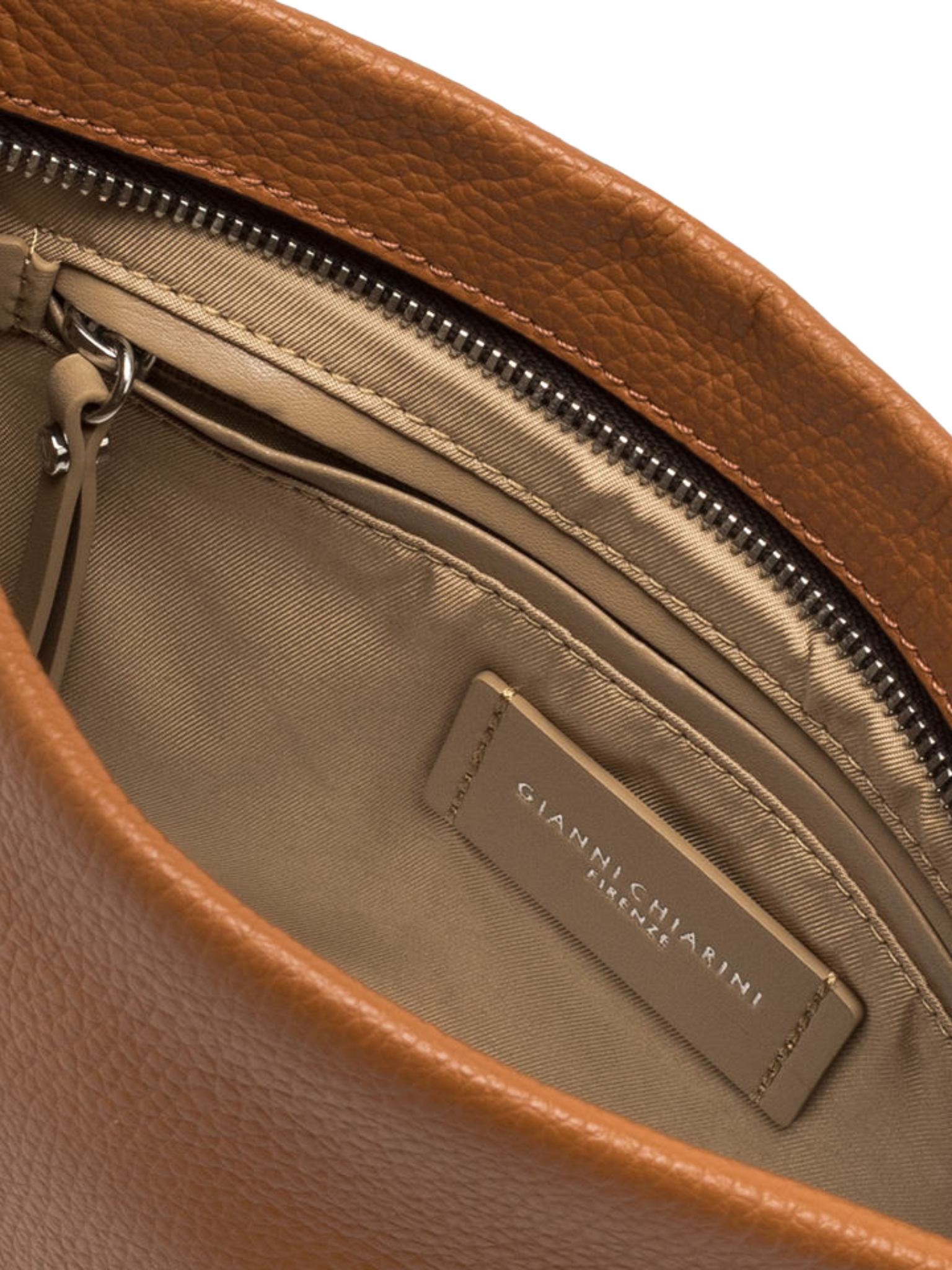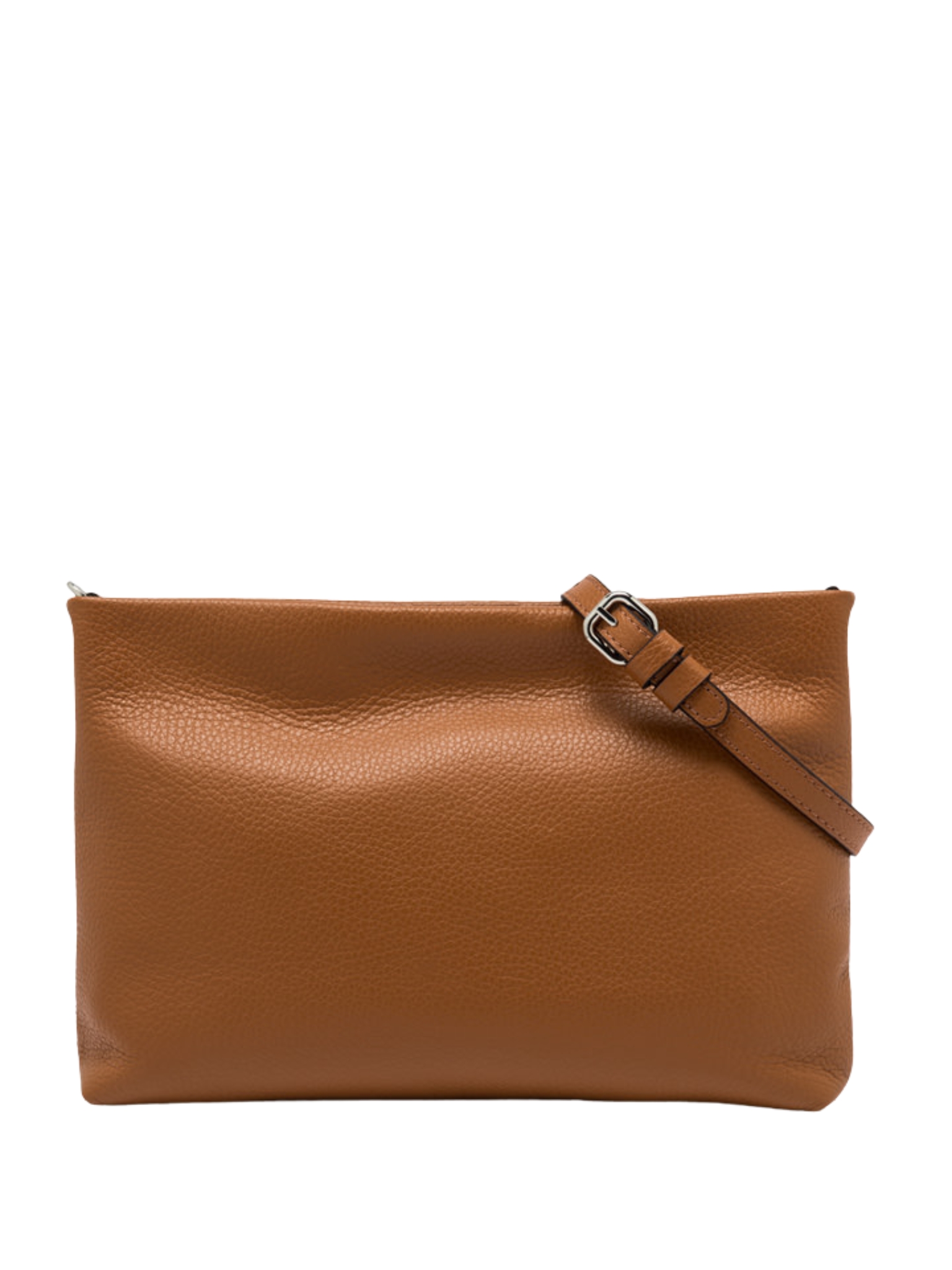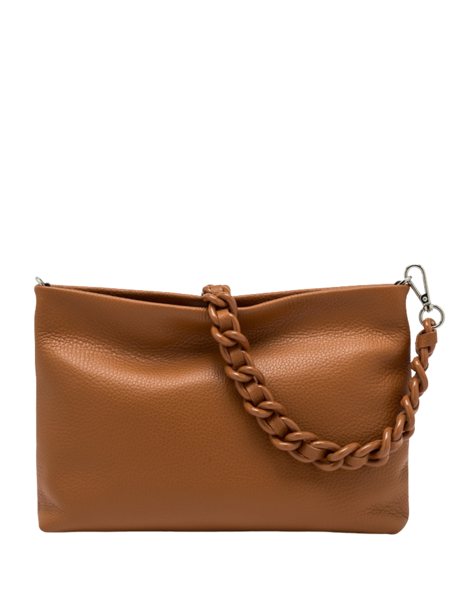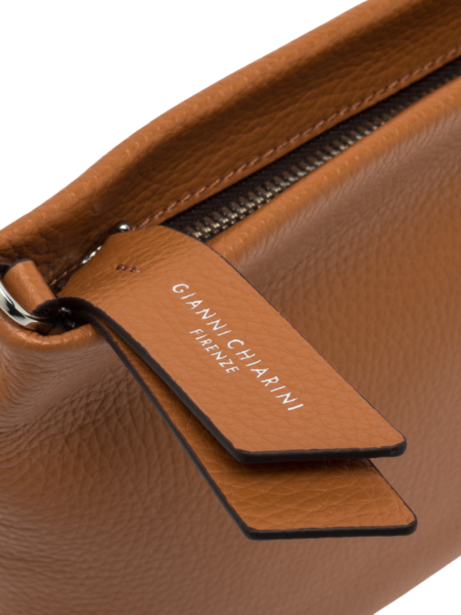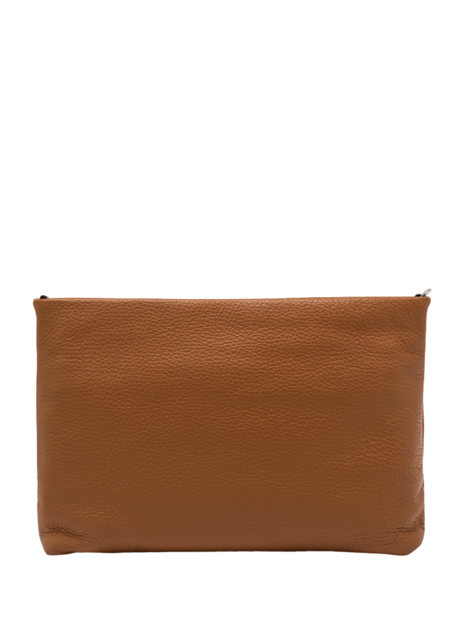 Brenda è l'iconica pochette di Gianni Chiarini Firenze, realizzata in pelle martellata. Il maxi cinturino consente di indossarla al polso, mentre l'interno è dotato di una tasca piatta. La tracolla in tessuto intrecciato, regolabile e removibile, permette di portarla comodamente crossbody, combinando praticità e raffinatezza. Dimensioni: 32x22x2 cm
