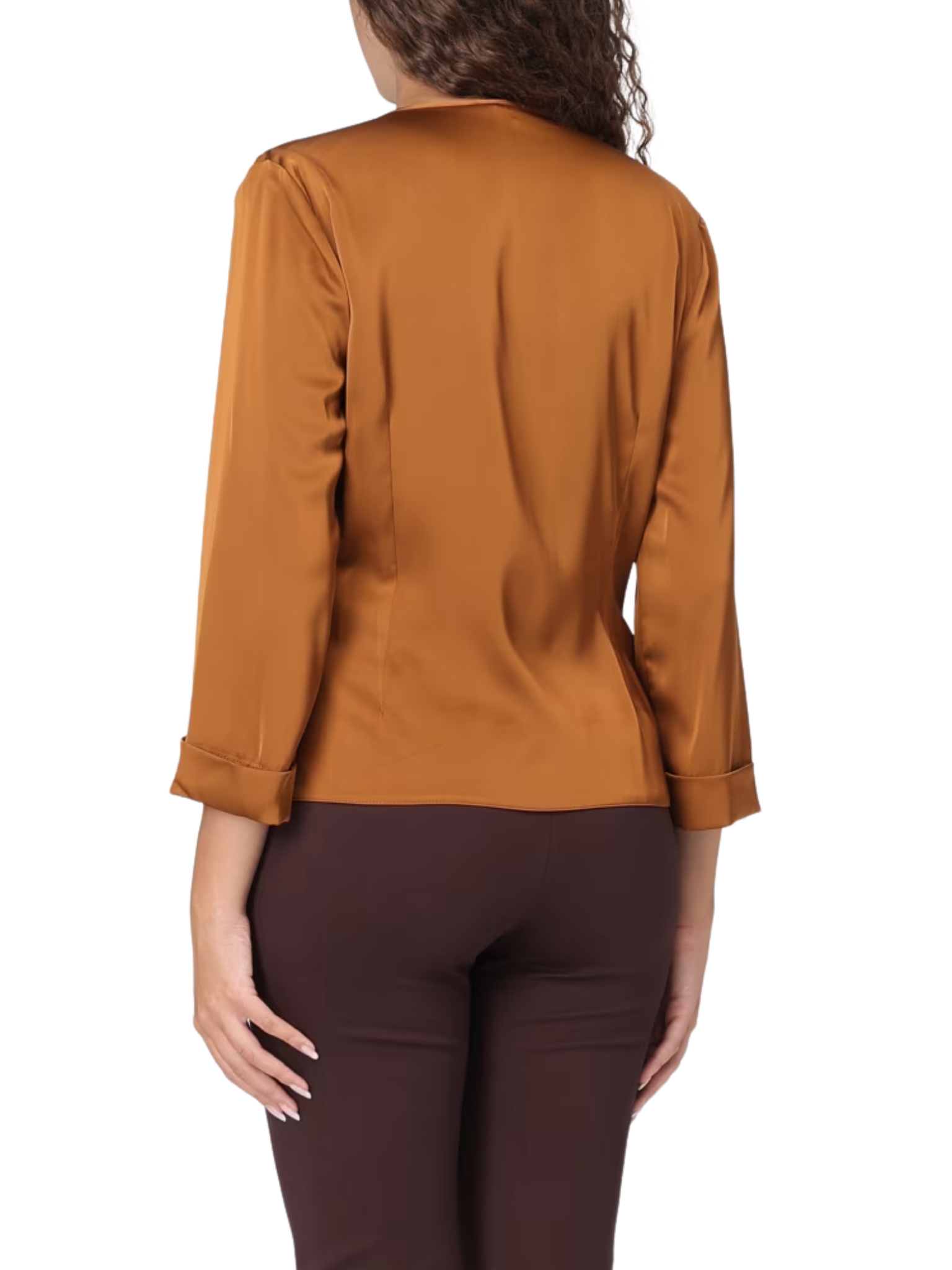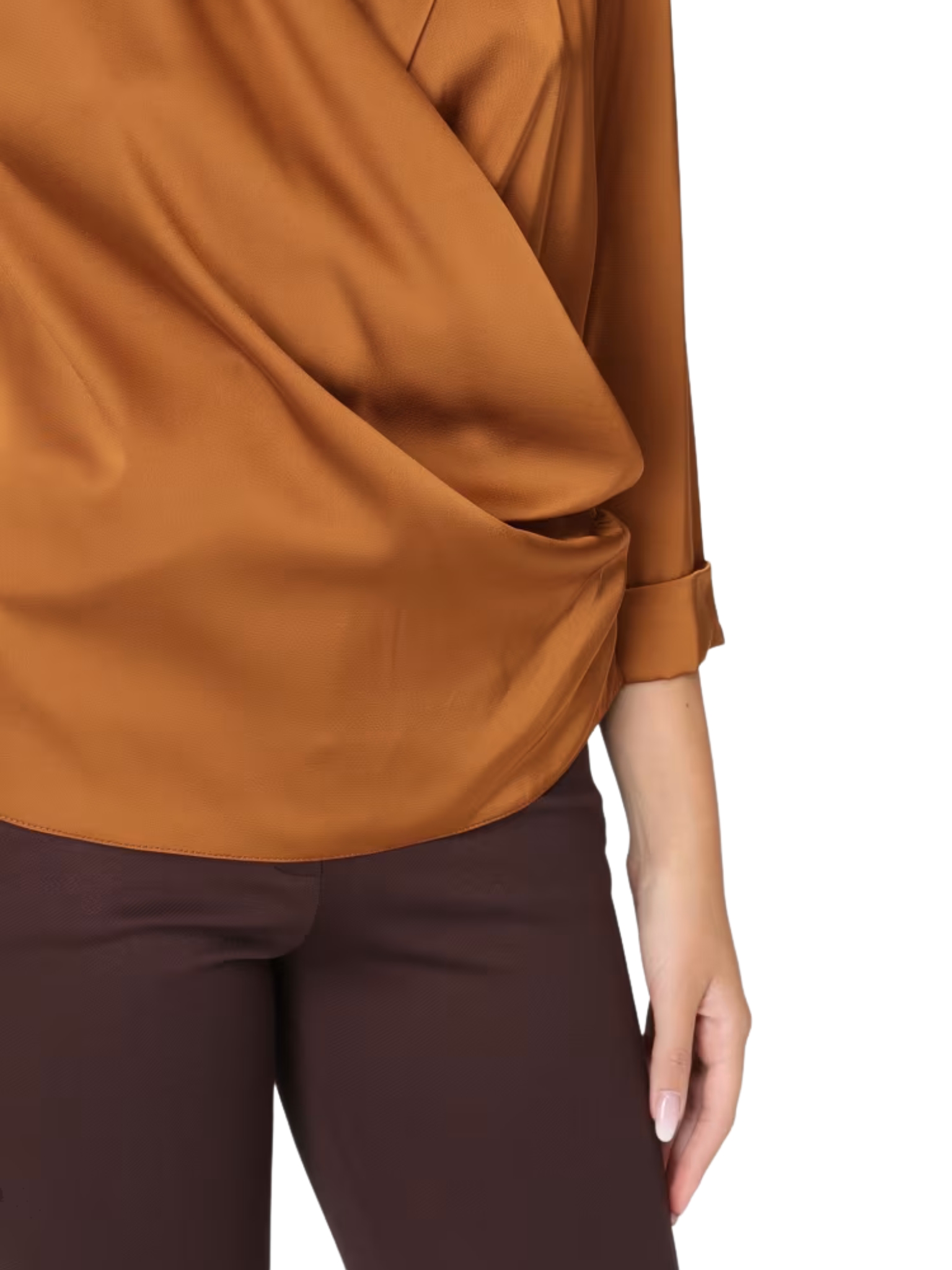Casacca in viscosa di raso, manica lunga ad incrocio sul davanti. Collo a giro scollato