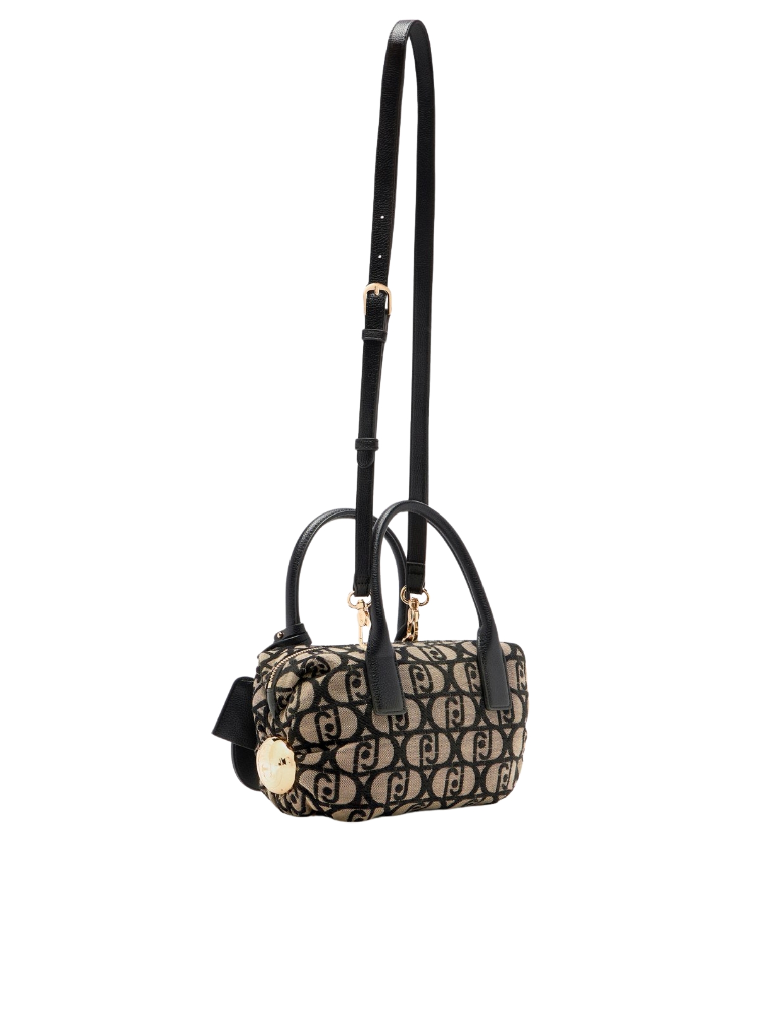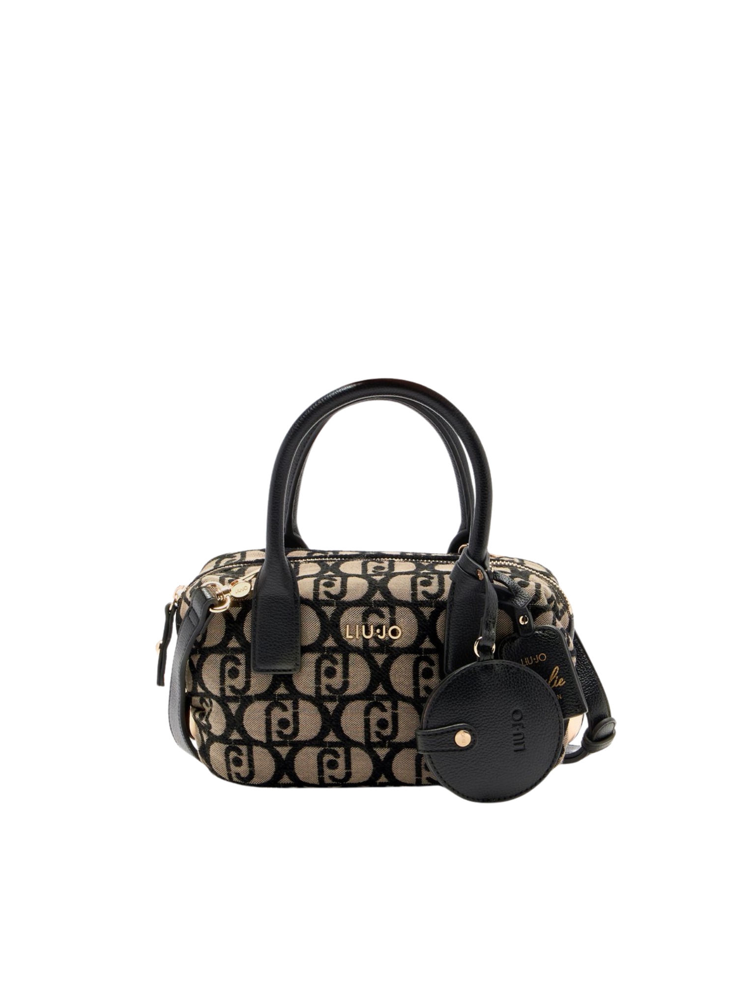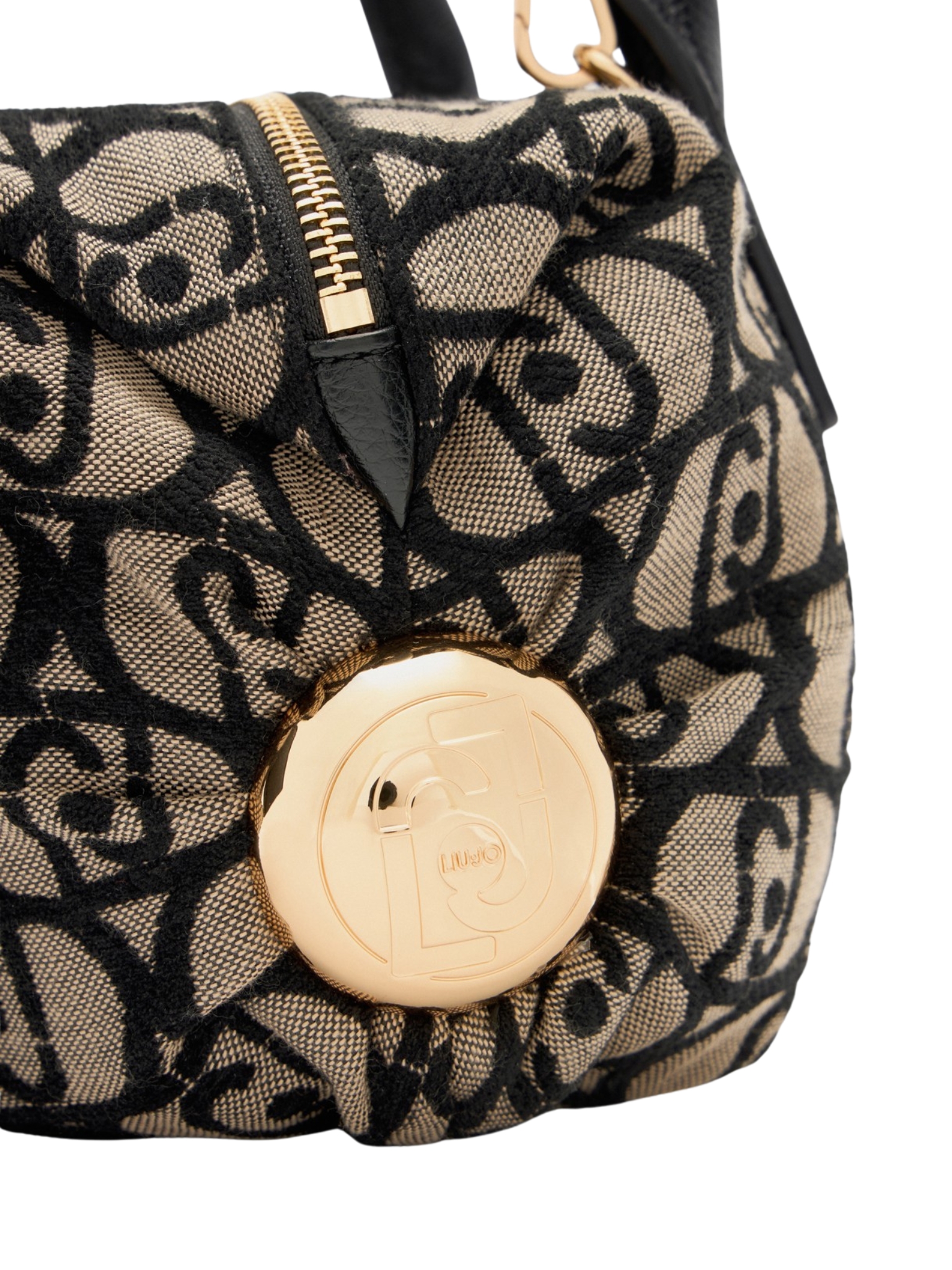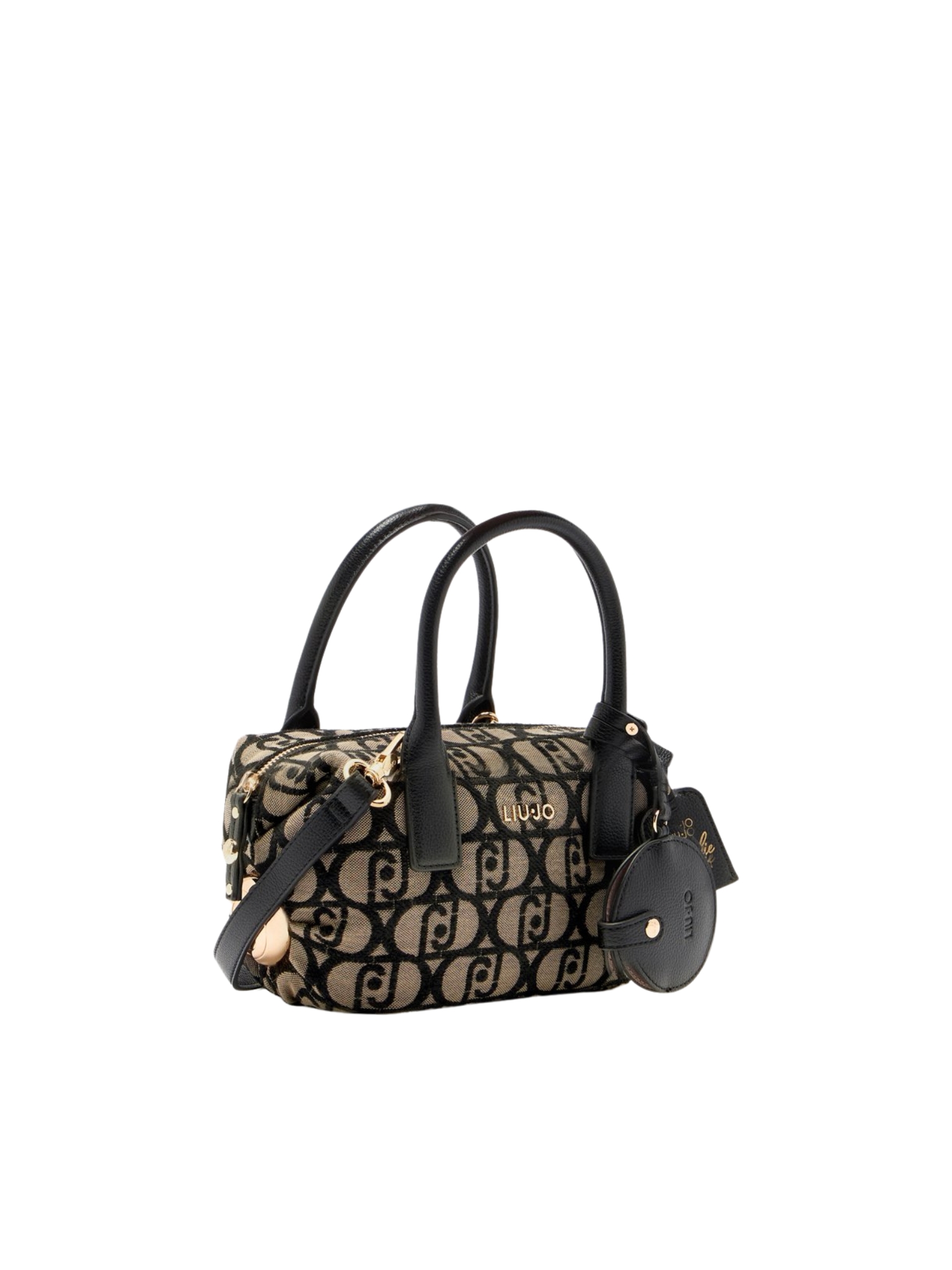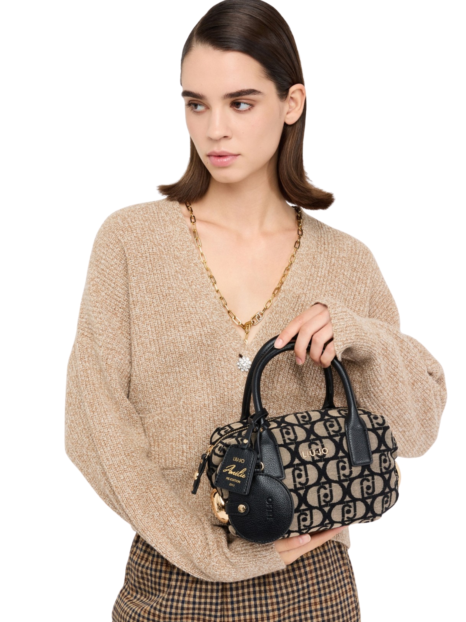 Mini borsa a mano in tessuto con dettagli in eco pelle, logo jacquard all over e logo in metallo. Comodi manici con tracolla regolabile e rimovibile. Charms logati e Maxi borchie logate in metallo. Piedini metallici al fondo, chiusura con zip e fodera interna logata. L'accessorio può essere indossato anche a spalla e/o a tracolla. Misure: 27 x 12 x 16 cm