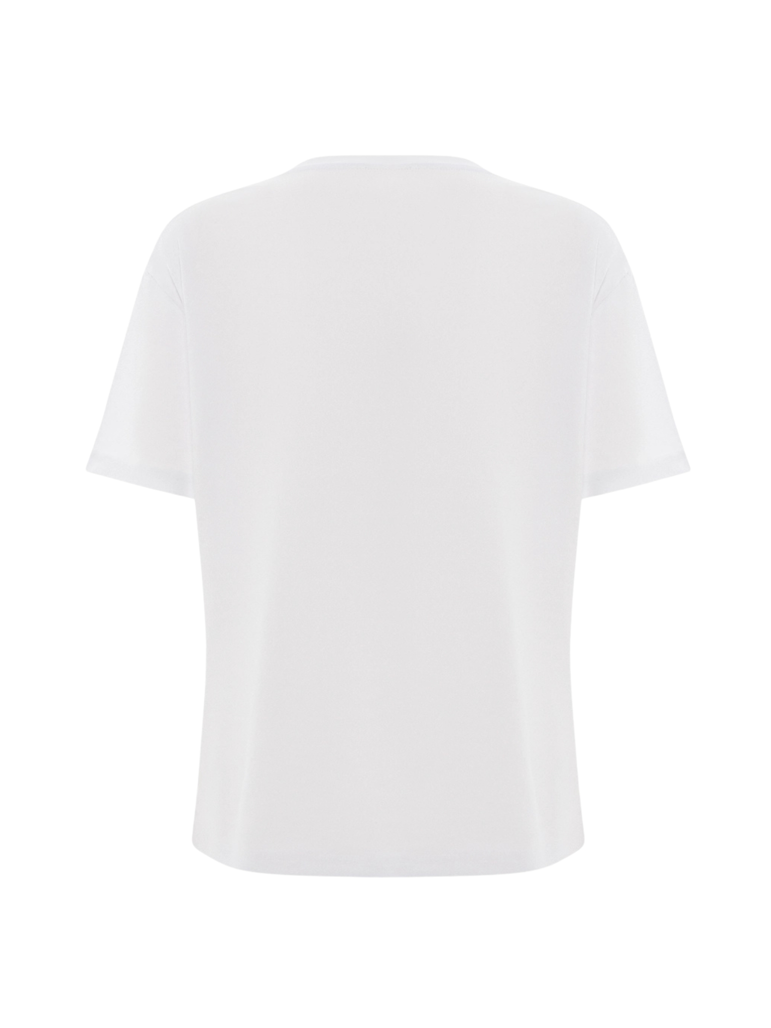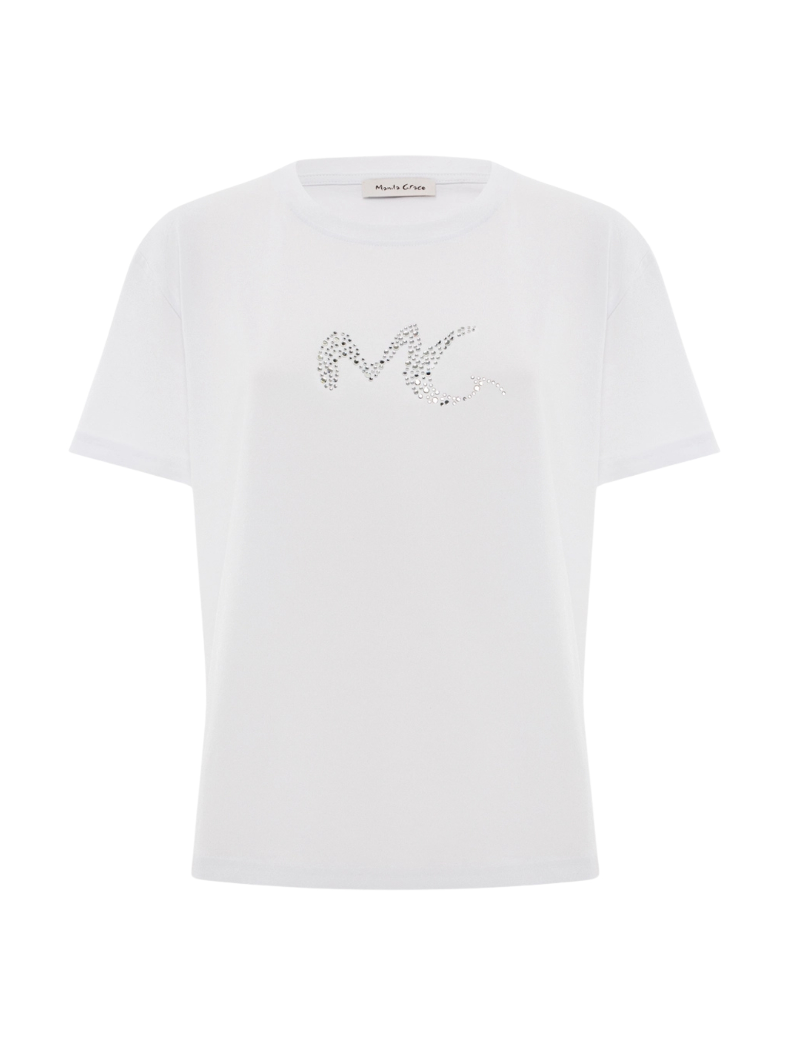 T-shirt in jersey di cotone con linea dritta e maniche corte. Il logo MG è protagonista sul davanti, impreziosito da una raffinata applicazione di strass tono su tono che dona un tocco di luce discreto. Un capo versatile dallo stile urbano-chic, ideale per completare look casual con un dettaglio distintivo