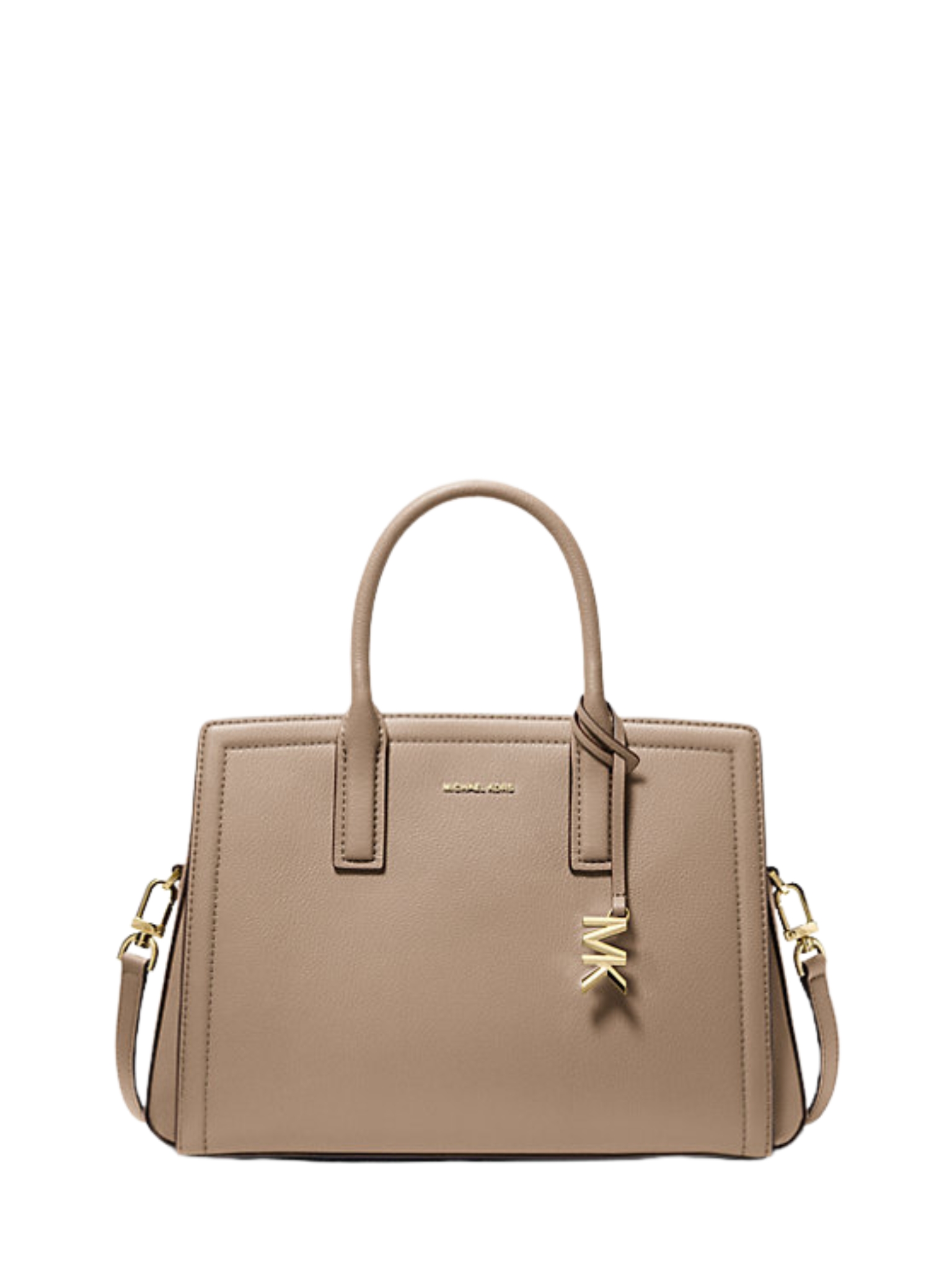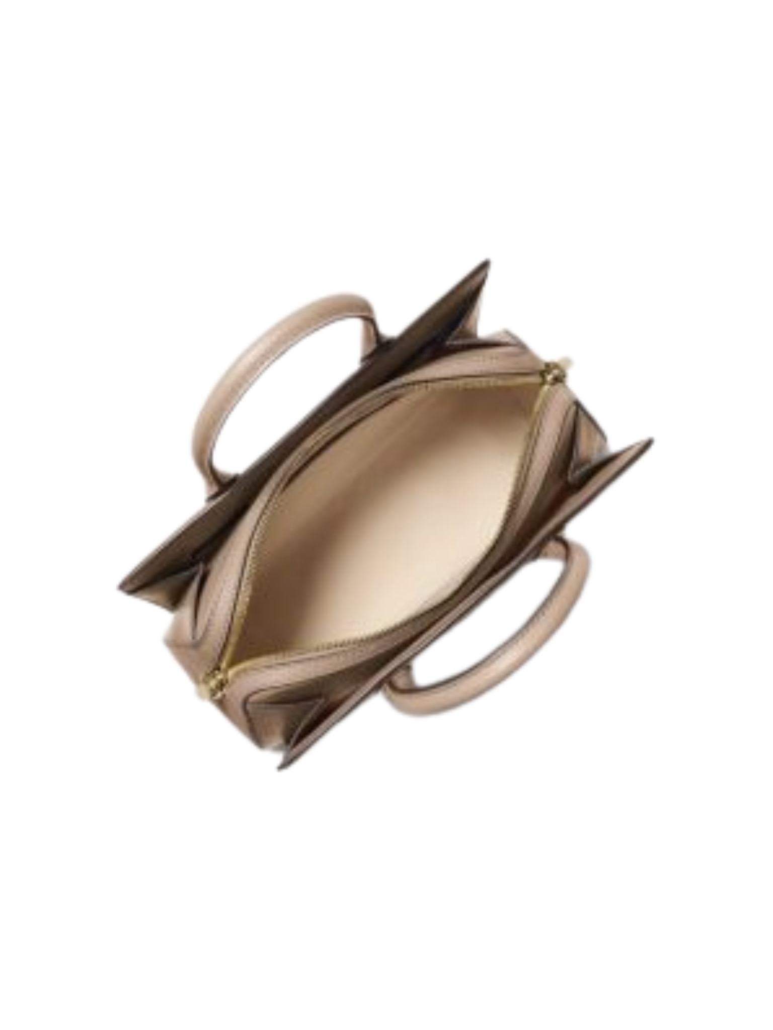 Borsa a mano in pelle, dettagli in metallo tonalità oro. Misure 29,2 cm L X 22,2 cm A X 14 cm P e tracolla regolabile: 49,5-57,2 cm. Dettagli esterno: tracolla removibile, dettagli interno: tasche posteriori a bustina e con zip, tasca centrale con zip. Chiusura con bottoni automatici. Custodia antipolvere non inclusa