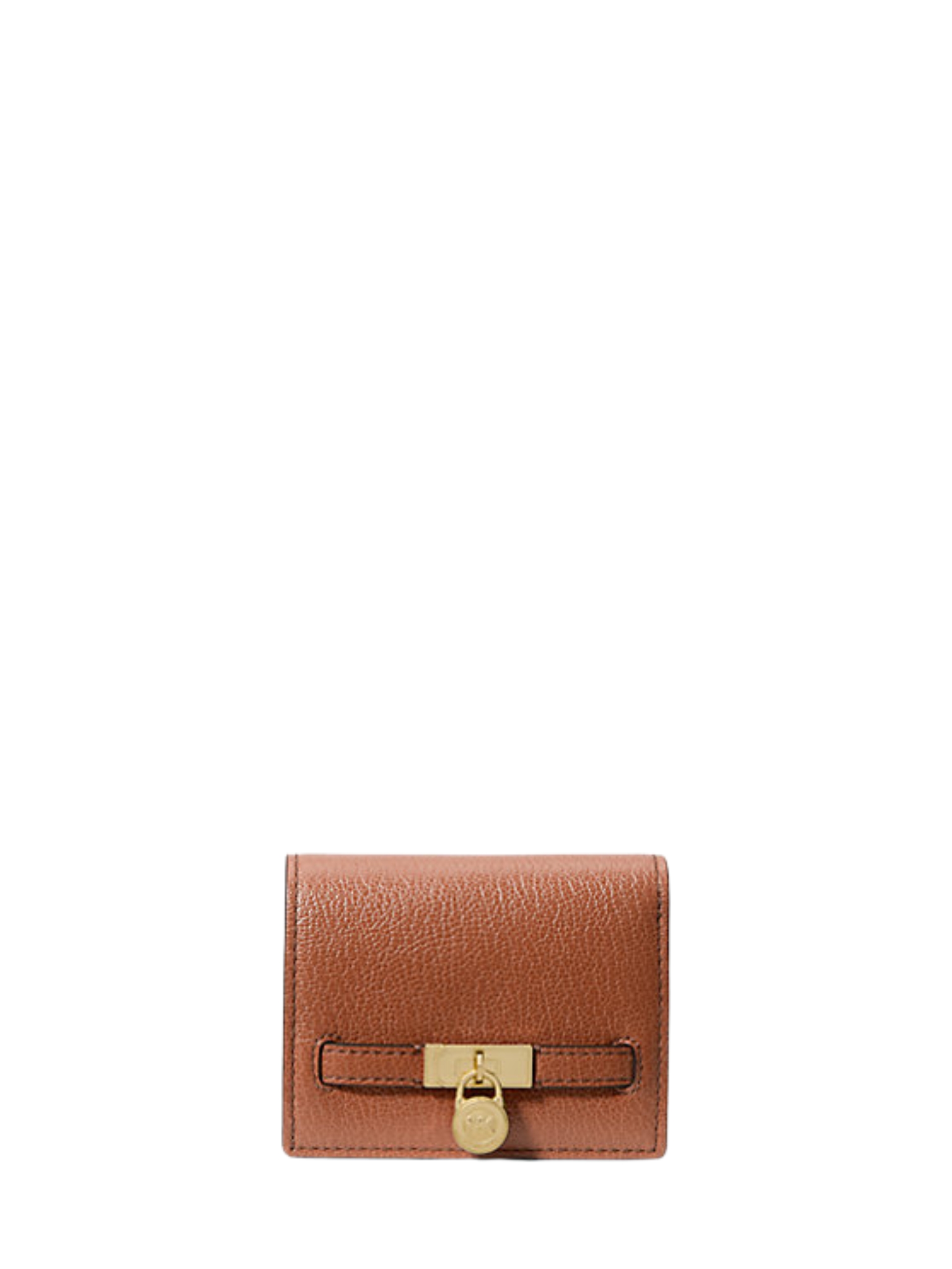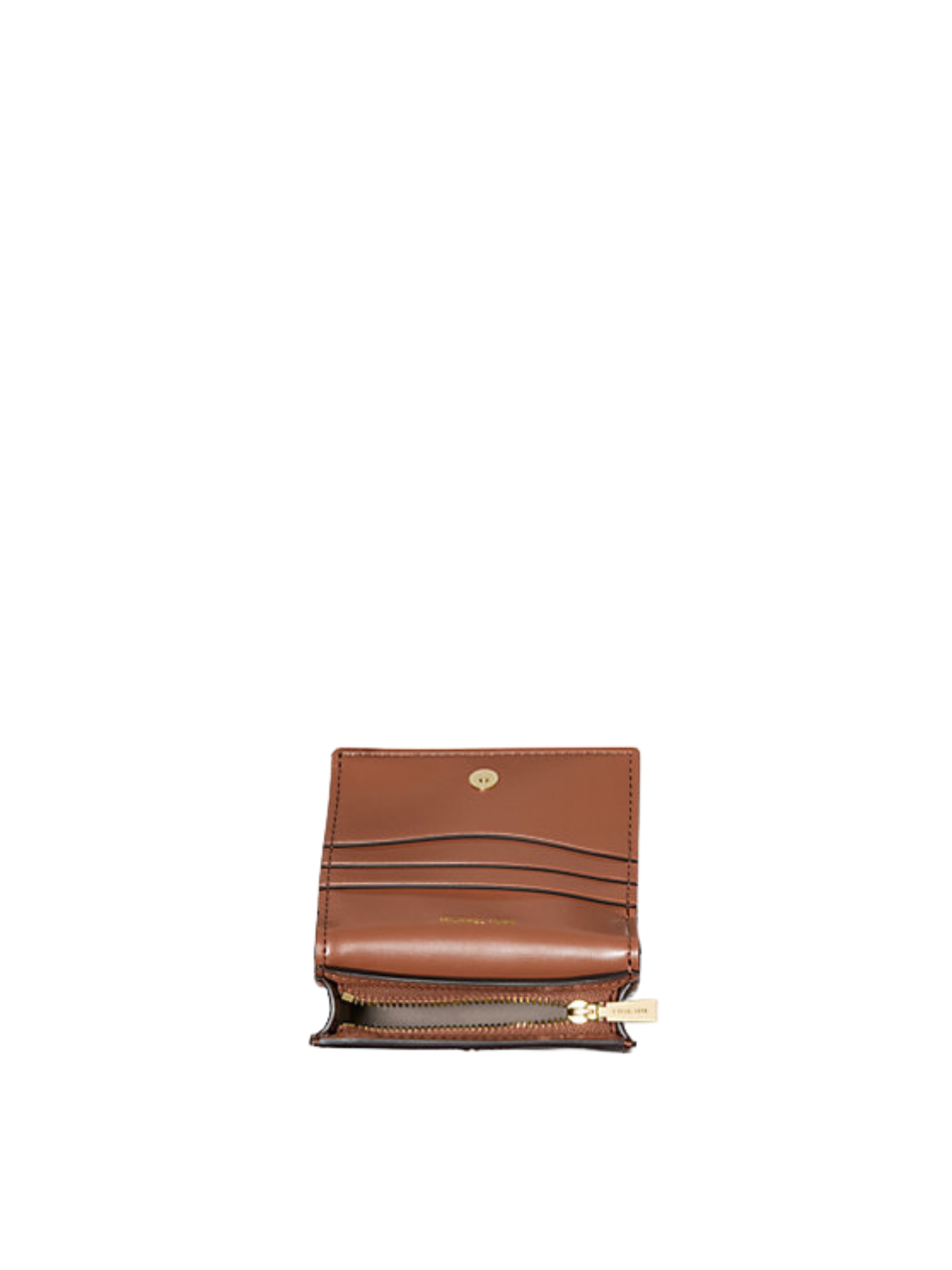 Portafoglio in pelle, dettagli in metallo tonalità oro. Dimensioni 10,8 cm L X 7,6 cm A X 3,8 cm P, dettagli esterno: tasca posteriore a bustina, dettagli interno: scomparto posteriore per banconote, tasca centrale con zip, 5 scomparti per carte di credito. Chiusura con bottone automatico