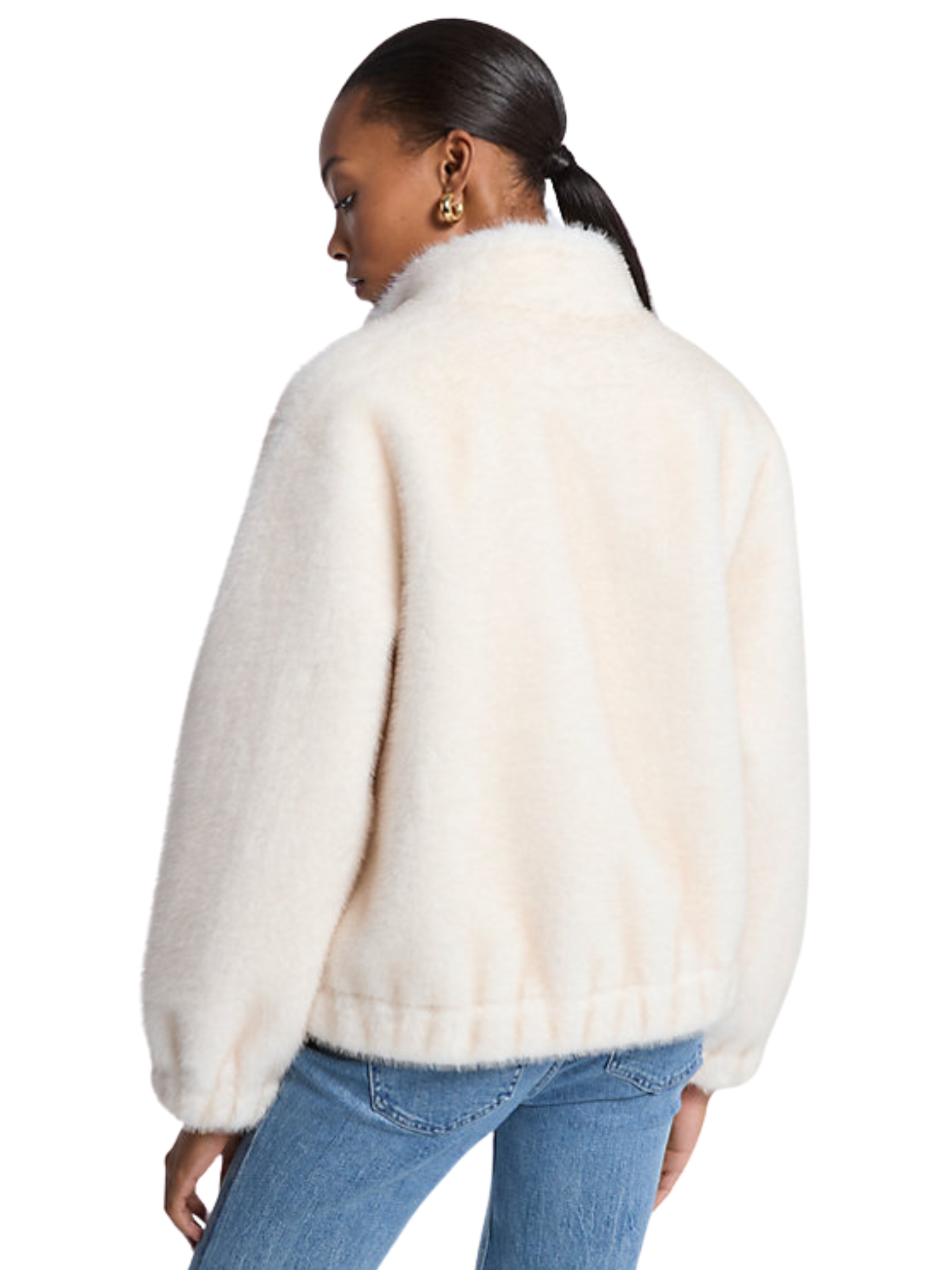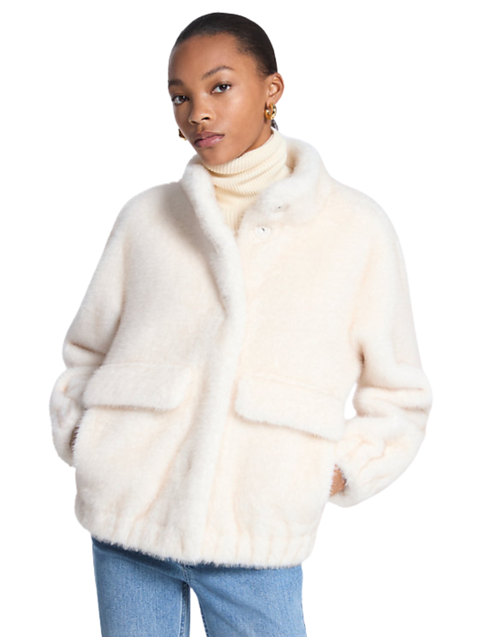 Giacca in pelliccia sintetica, modello bomber. Chiusura con bottone automatico e tasche sul davanti. Collo dritto