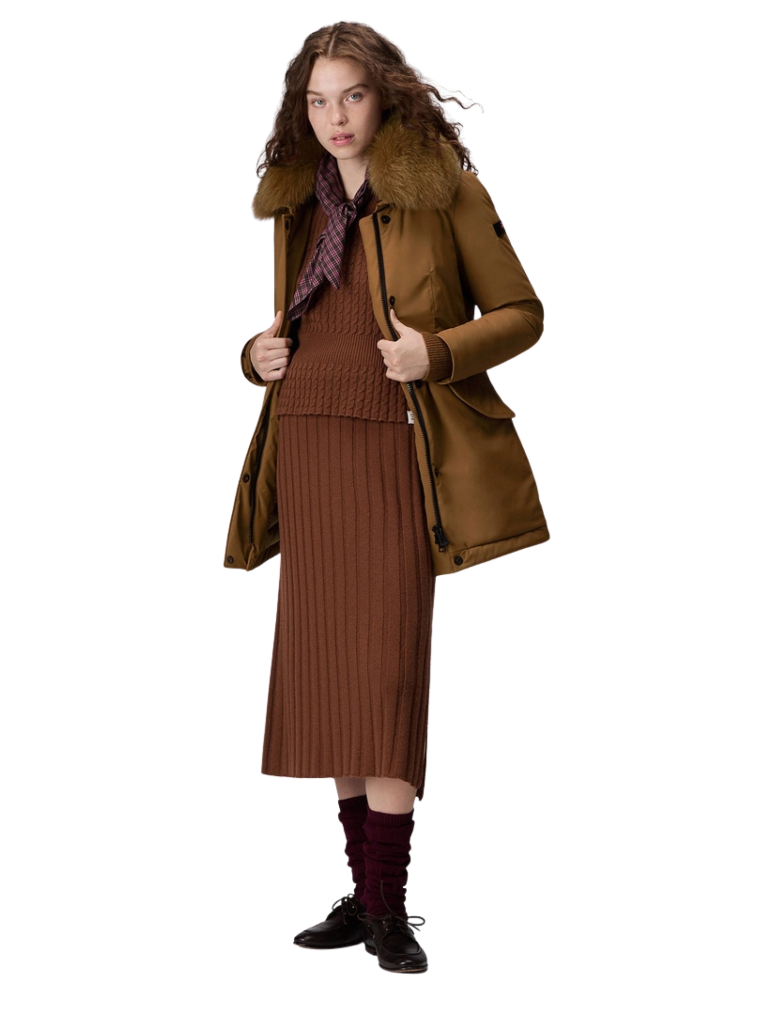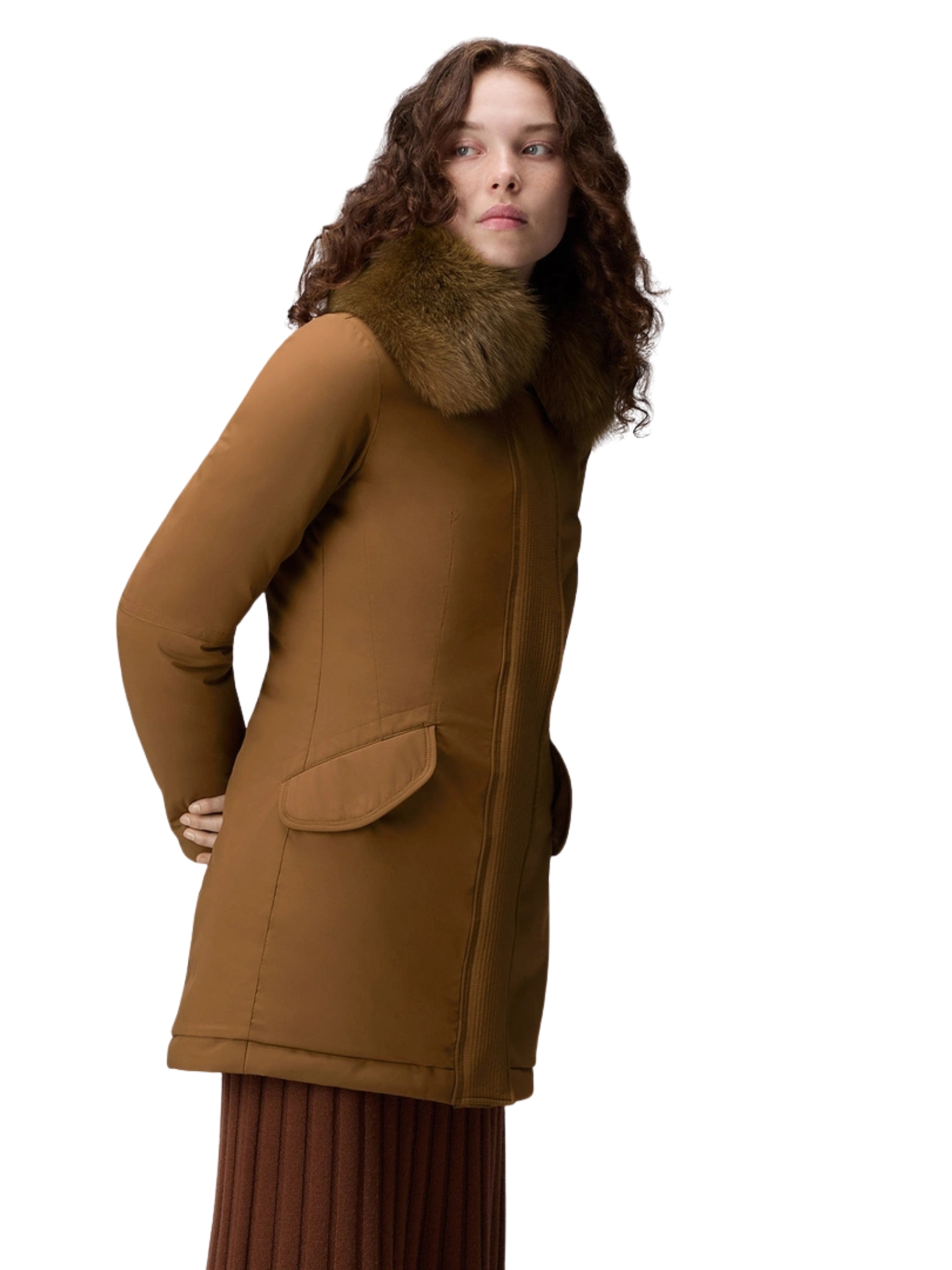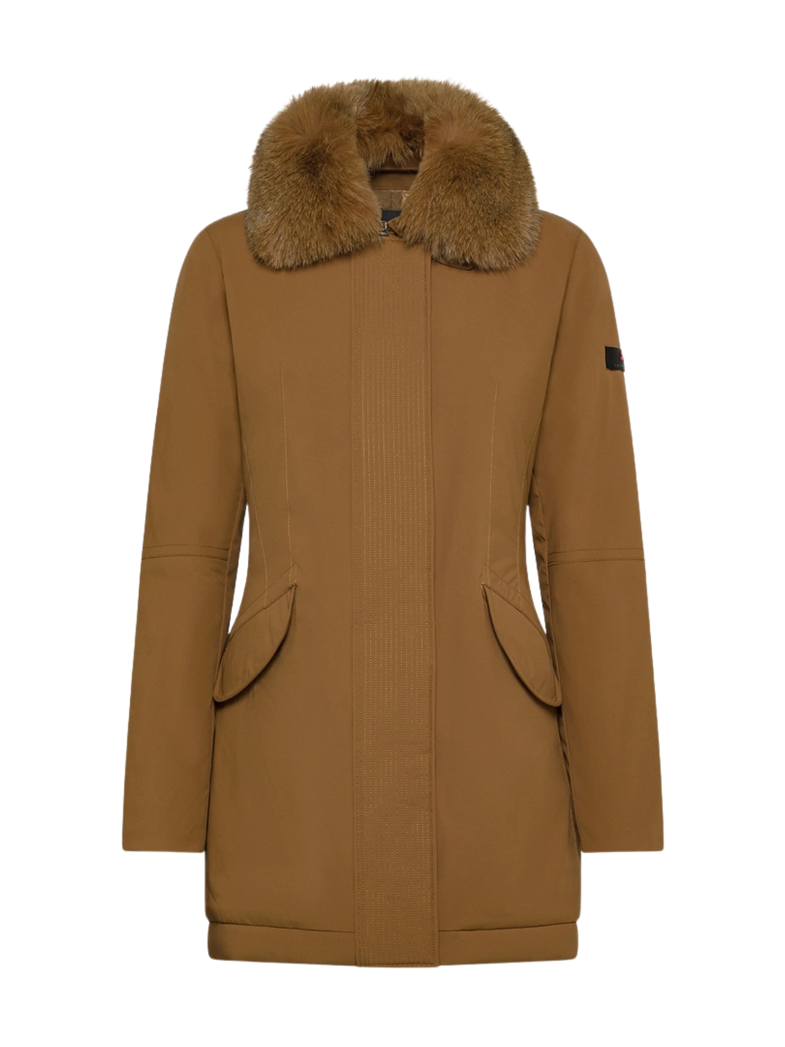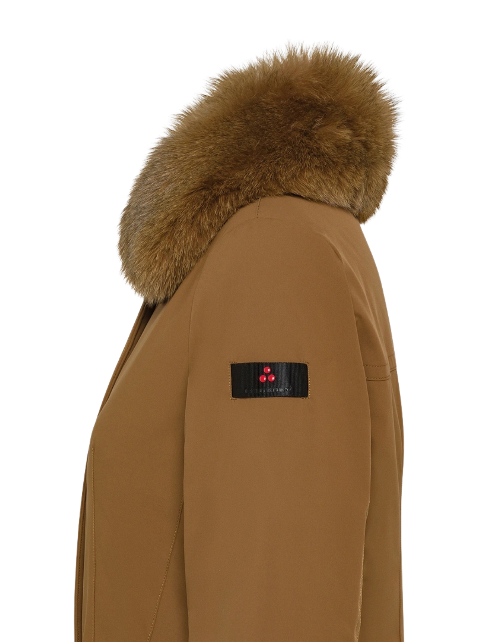 Piumino liscio in piuma riciclata e tela di nylon stretch, dotato di membrana performante e resistente a pioggia e vento. Il modello è impreziosito da un ampio collo in pelliccia di volpe staccabile, in tono colore e ha un impeccabile fit asciutto che valorizza la silhouette femminile. Collo a camicia, chiusura nascosta con zip a doppio cursore e bottoni. Trattamento TeflonTM EcoElite.
