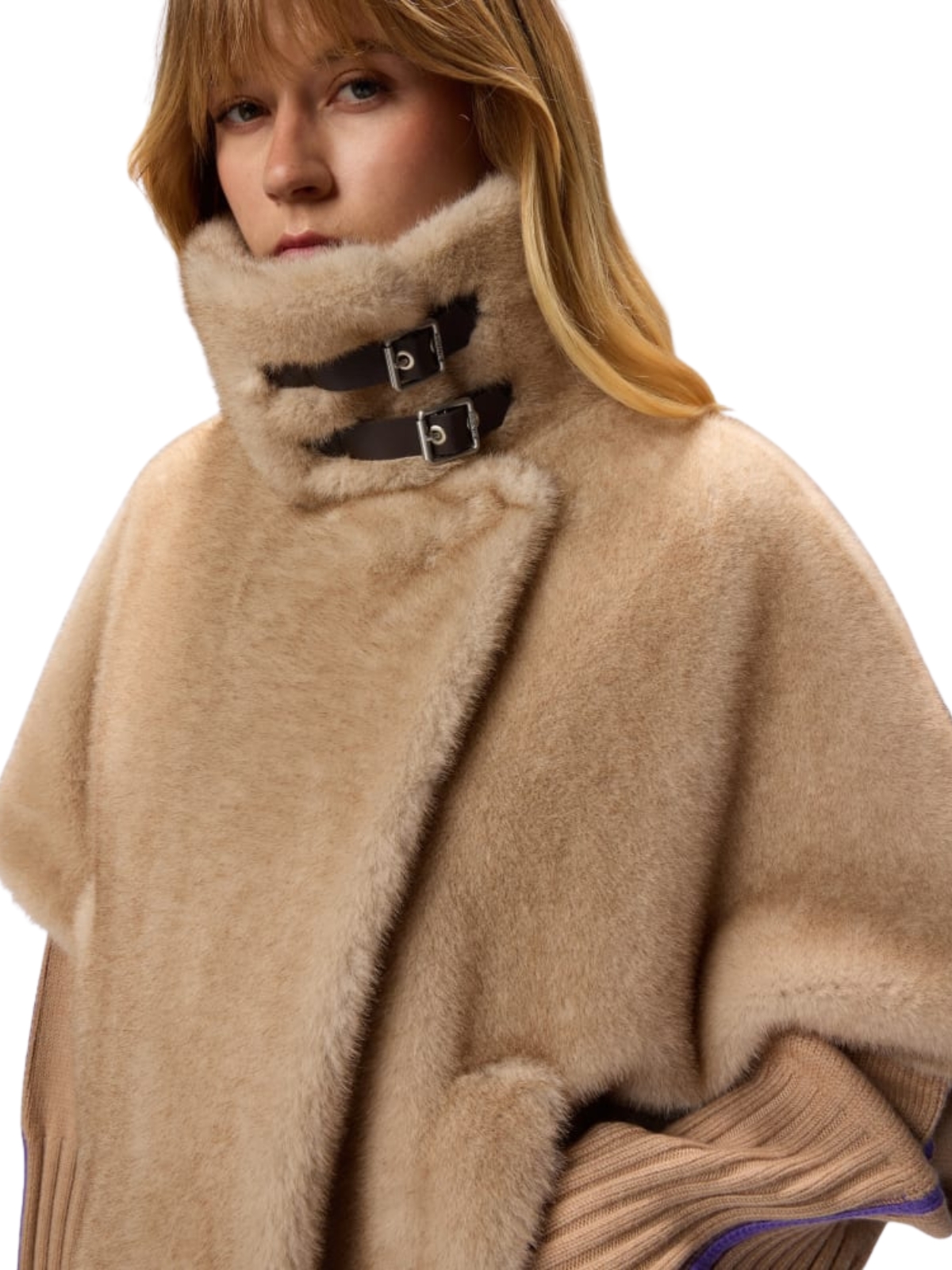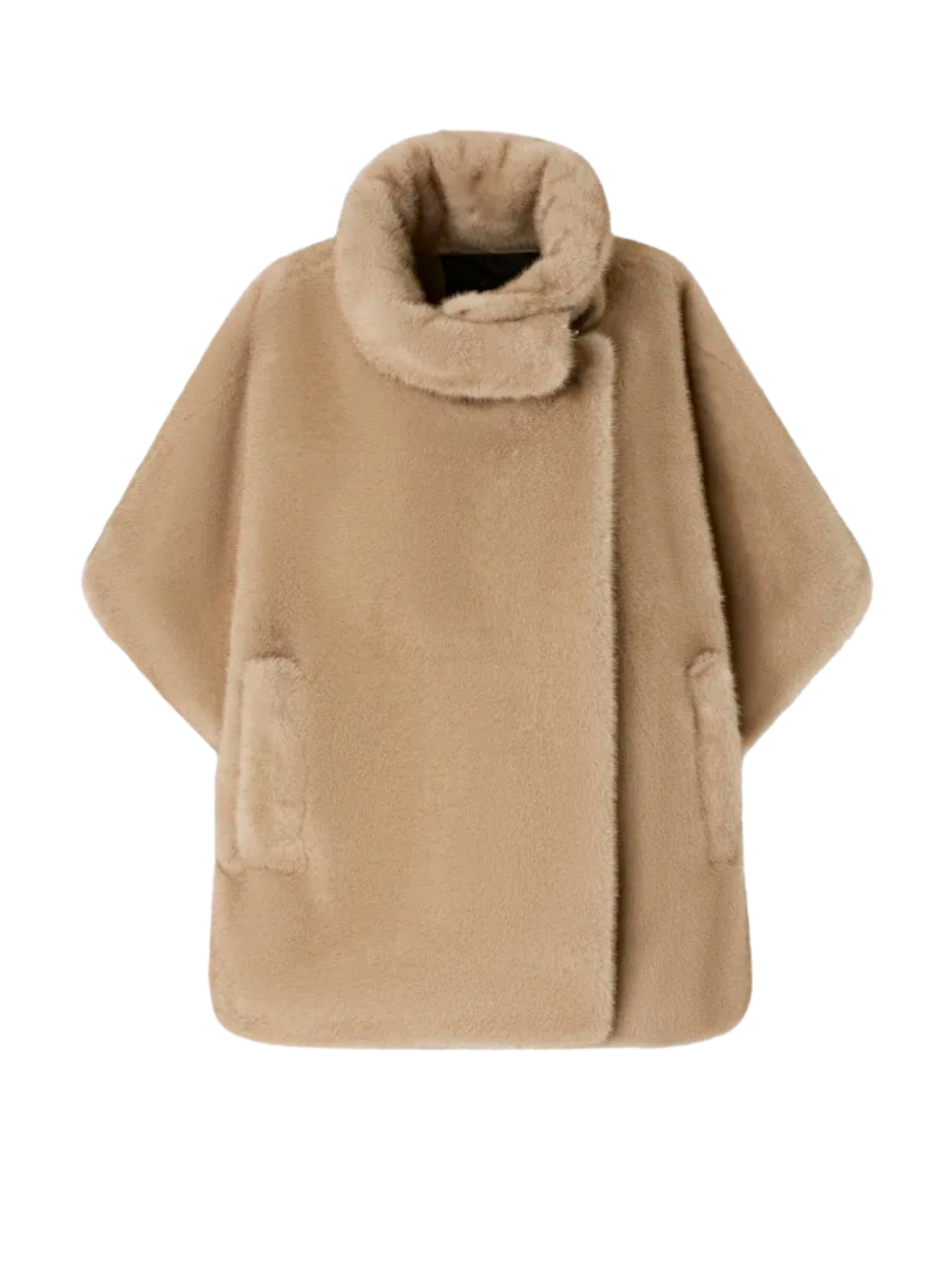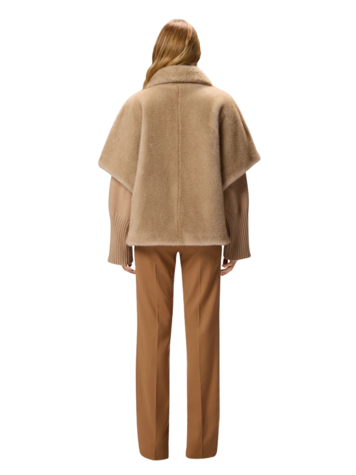 Cappa corta con maniche corte, tasche a filetto, avvolgente collo ripiegato e chiusura frontale decentrata. Il capo è realizzato in morbido tessuto Aspen dall'effetto pelliccia, particolarmente piacevole al tatto. Modello foderato. Il capospalla è ideale per accompagnarti nelle giornate più fresche di inizio stagione all'aperto, con il massimo comfort, senza rinunciare a un tocco di stile.