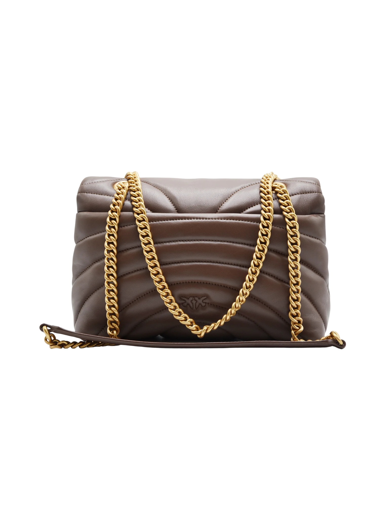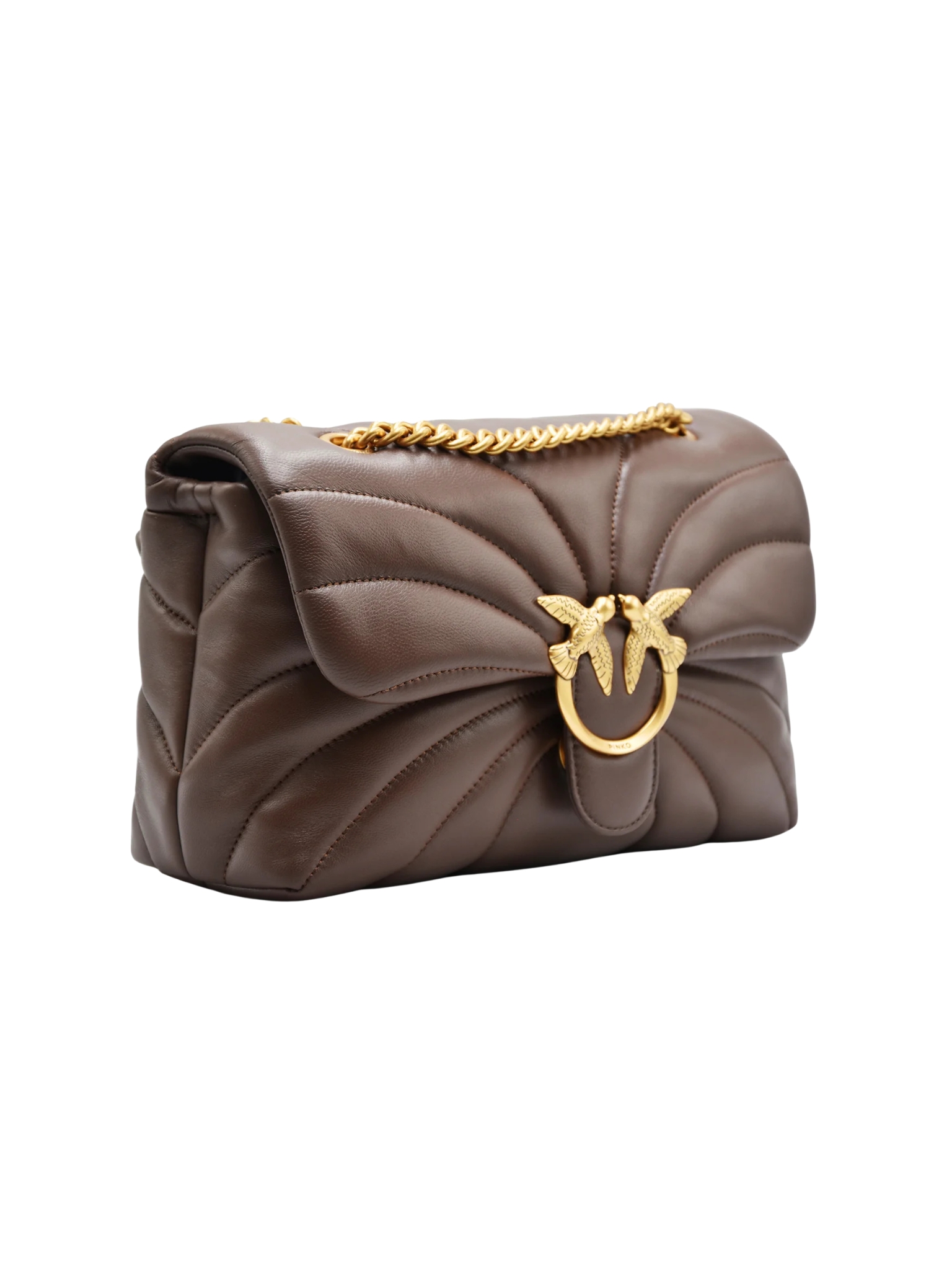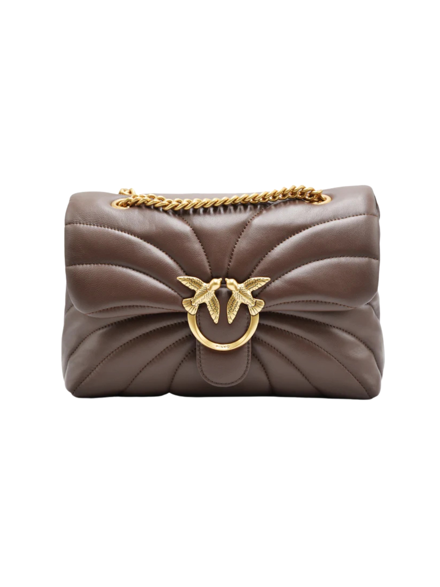 Borsa piccola morbida a tracolla Mini Love Bag Puff in nappa con trapuntatura Butterfly, che ricorda la caratteristica sagoma delle ali di farfalla. La tracolla a catena in metallo con spallaccio in nappa è scorrevole, e può essere doppiata per indossare la borsetta a spalla. La chiusura con patta è completata dall'iconica fibbia in metallo Love Birds Diamond Cut, galvanica antique gold. L'interno è foderato in microfibra scamosciata e comprende una pratica tramezza chiusa con zip e una tasca interna, per una migliore gestione dello spazio.
