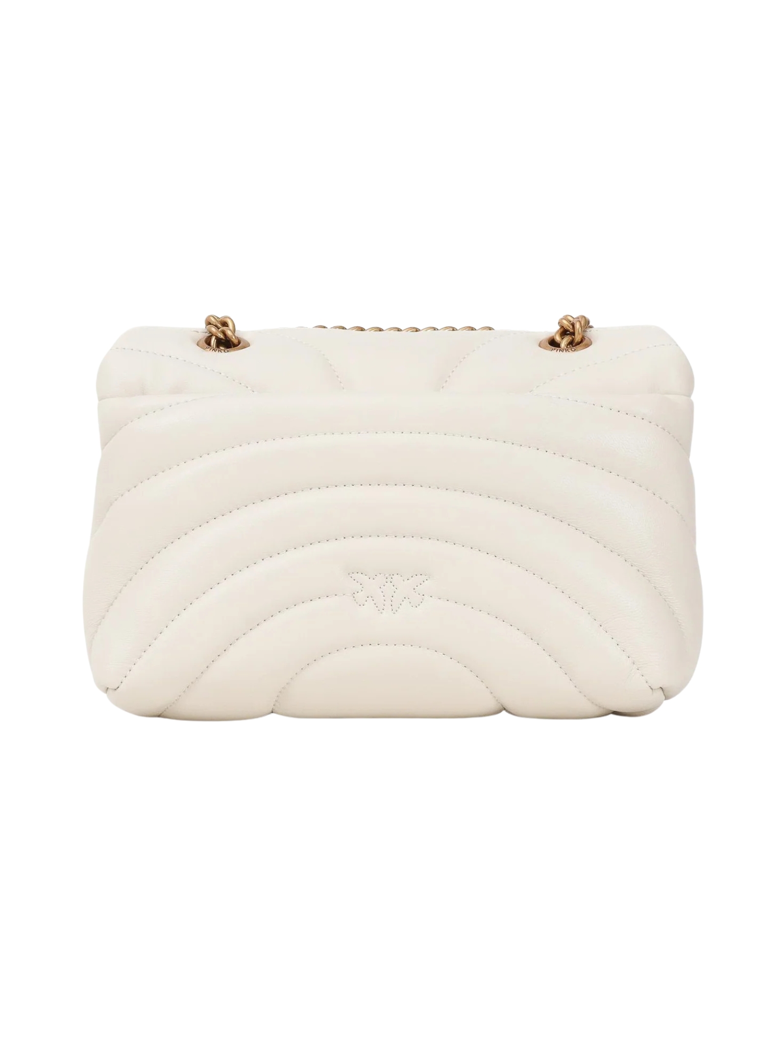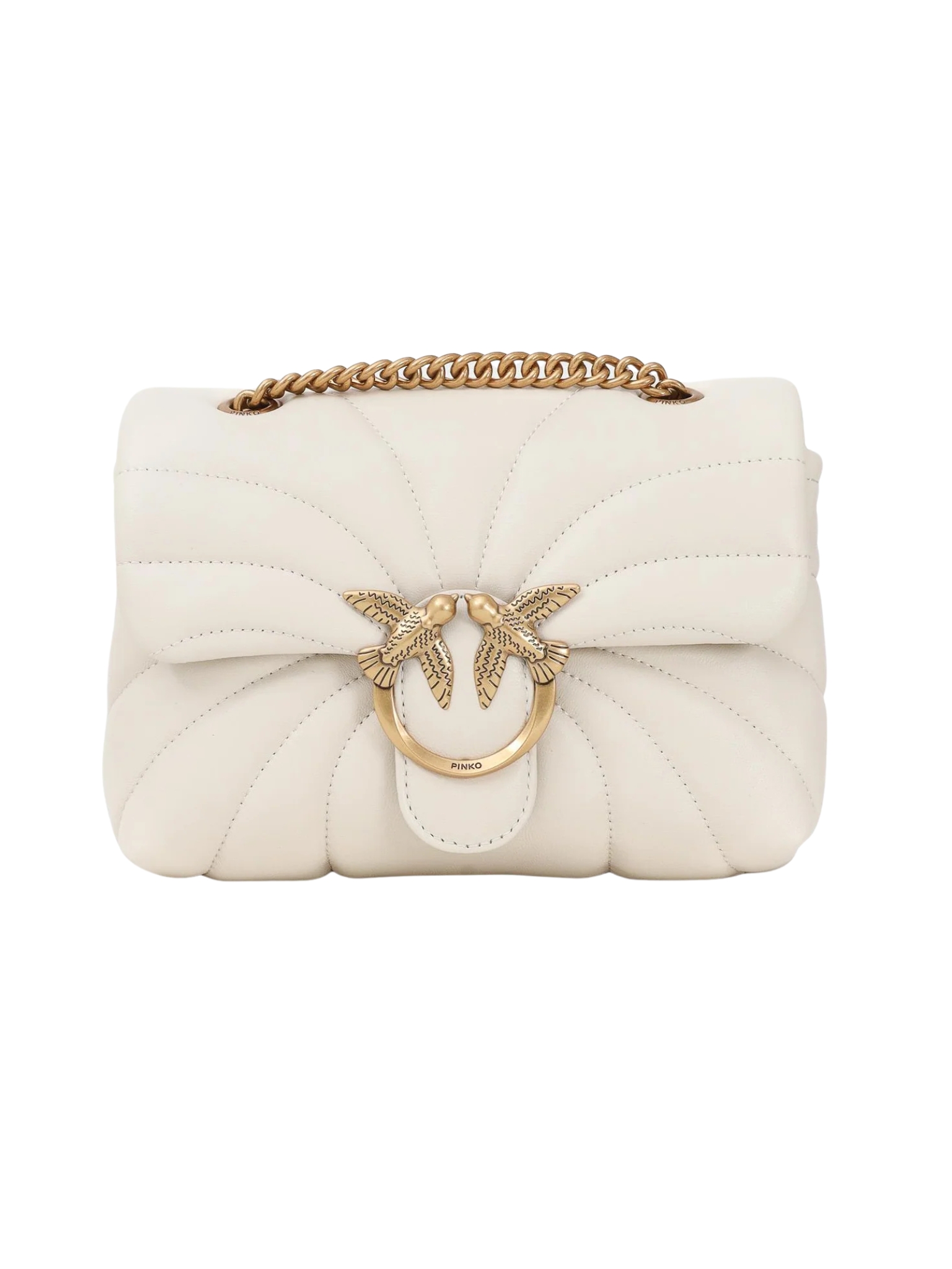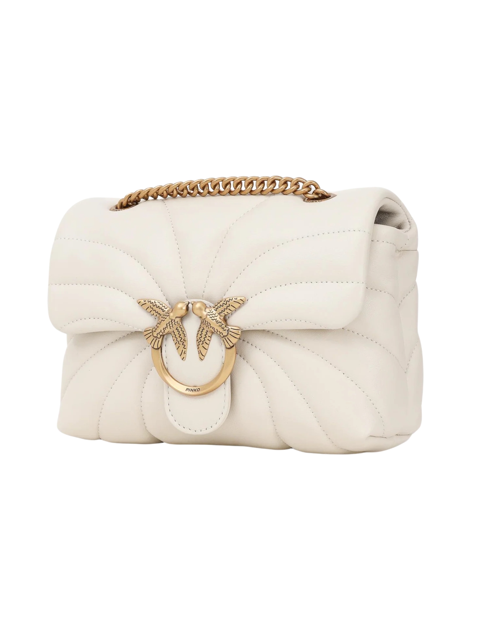Borsa piccola morbida a tracolla Mini Love Bag Puff in nappa con trapuntatura Butterfly, che ricorda la caratteristica sagoma delle ali di farfalla. La tracolla a catena in metallo con spallaccio in nappa è scorrevole, e può essere doppiata per indossare la borsetta a spalla. La chiusura con patta è completata dall'iconica fibbia in metallo Love Birds Diamond Cut, galvanica antique gold. L'interno è foderato in microfibra scamosciata e comprende una pratica tramezza chiusa con zip e una tasca interna, per una migliore gestione dello spazio.