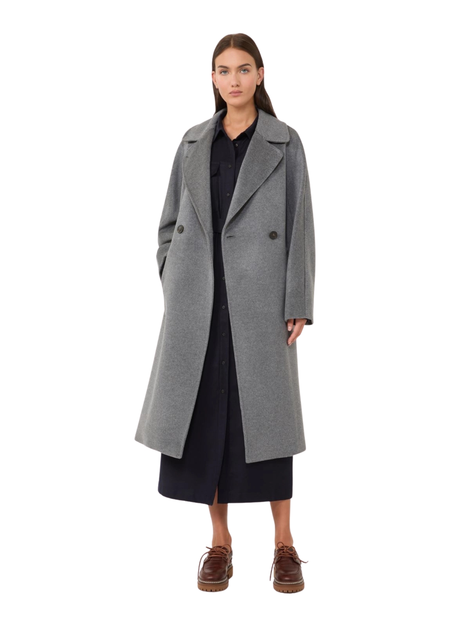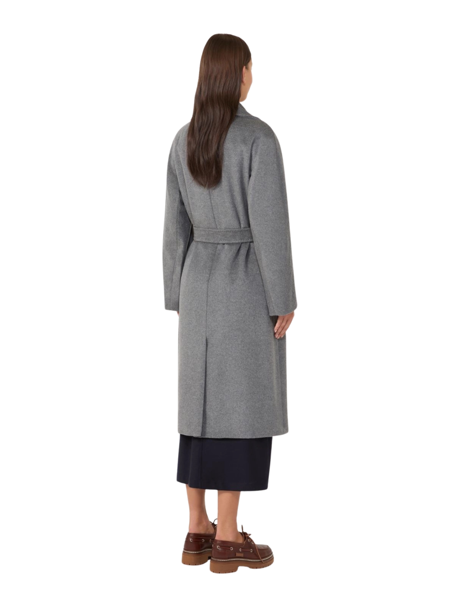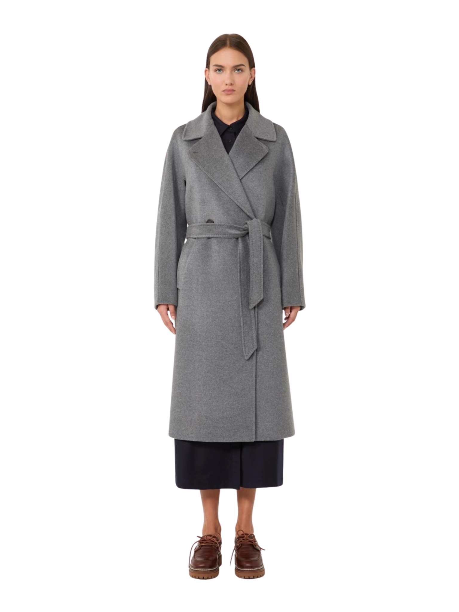 Cappotto midi sartoriale con cintura abbinata da annodare vita, in drap di pura lana, linea dritta. Collo a rever ampio, maniche lunghe a kimono, chiusura con bottoni. Tasche a filettone sui fianchi, foderato
