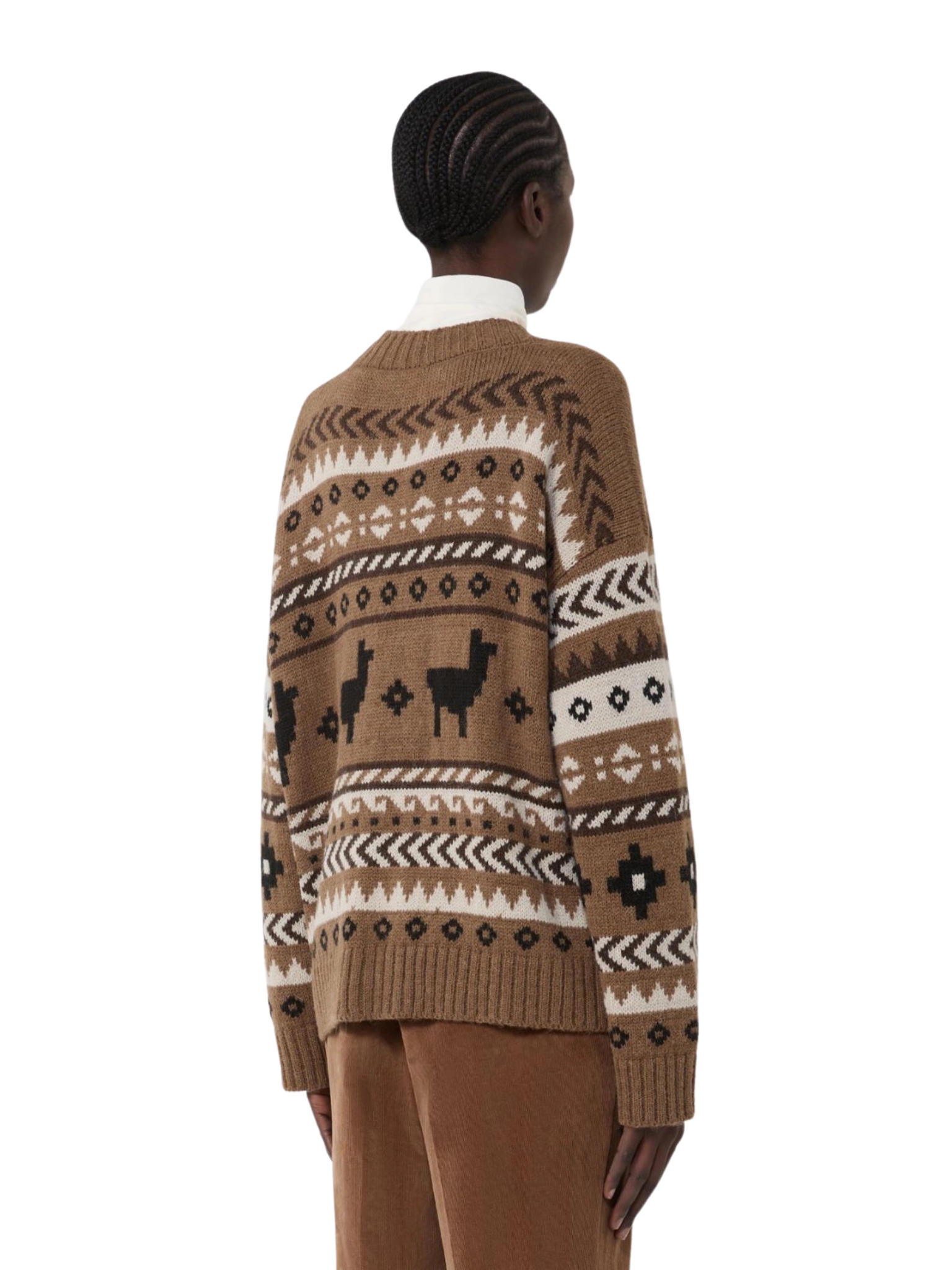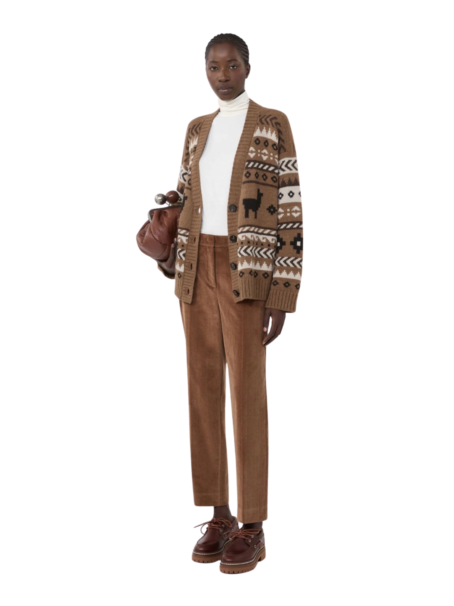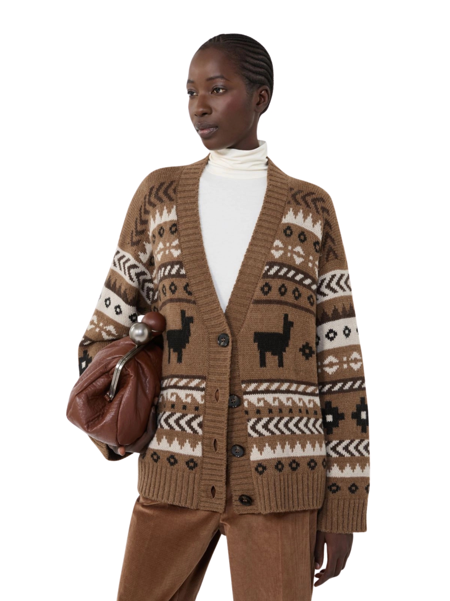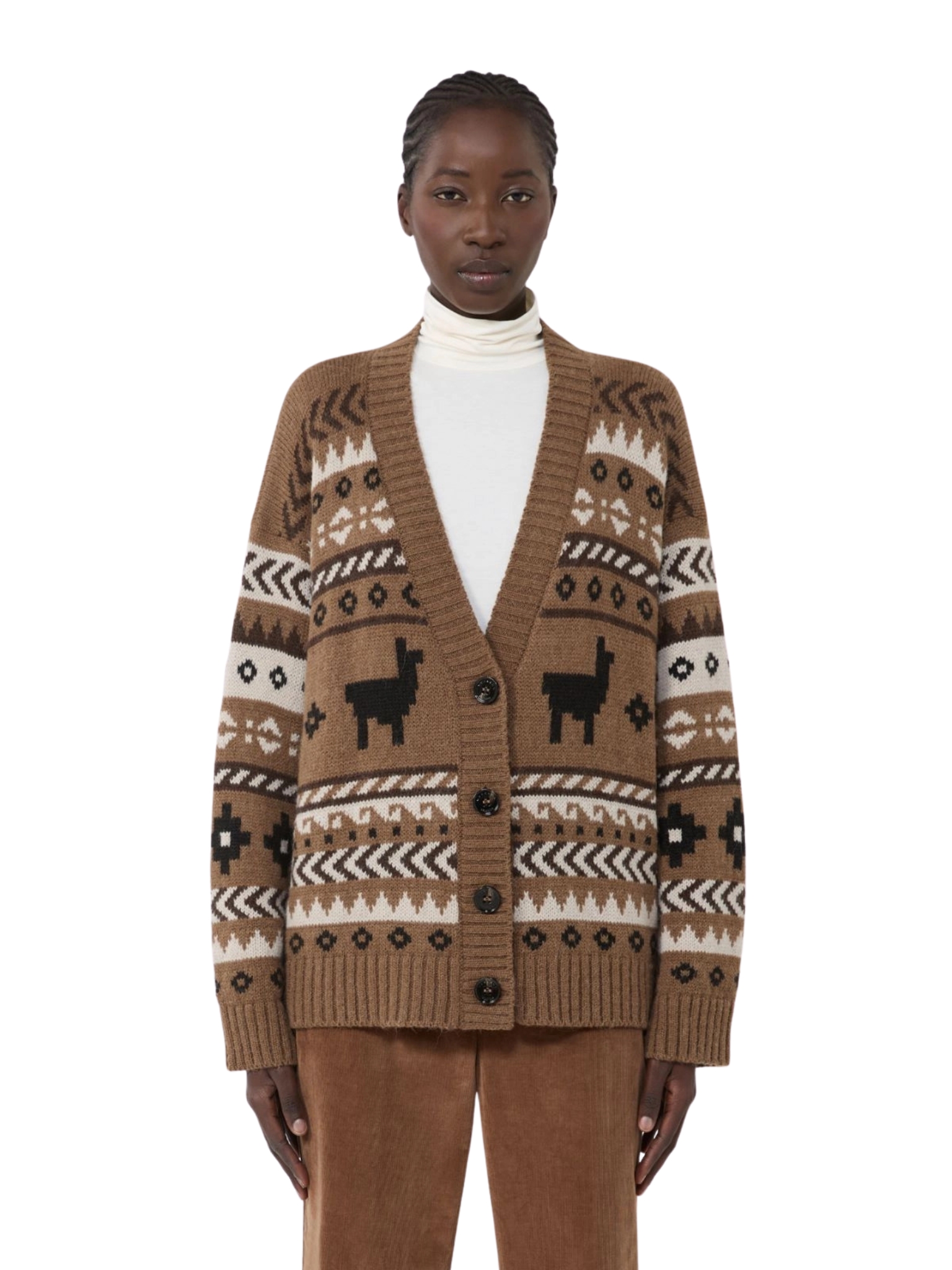Cardigan overfit, impreziosito da una lavorazione jacquard all over, in filato di lana e alpaca con scollo a V. Maniche lunghe a giro basso e chiusura frontale con bottoni. Bordi rifiniti a coste