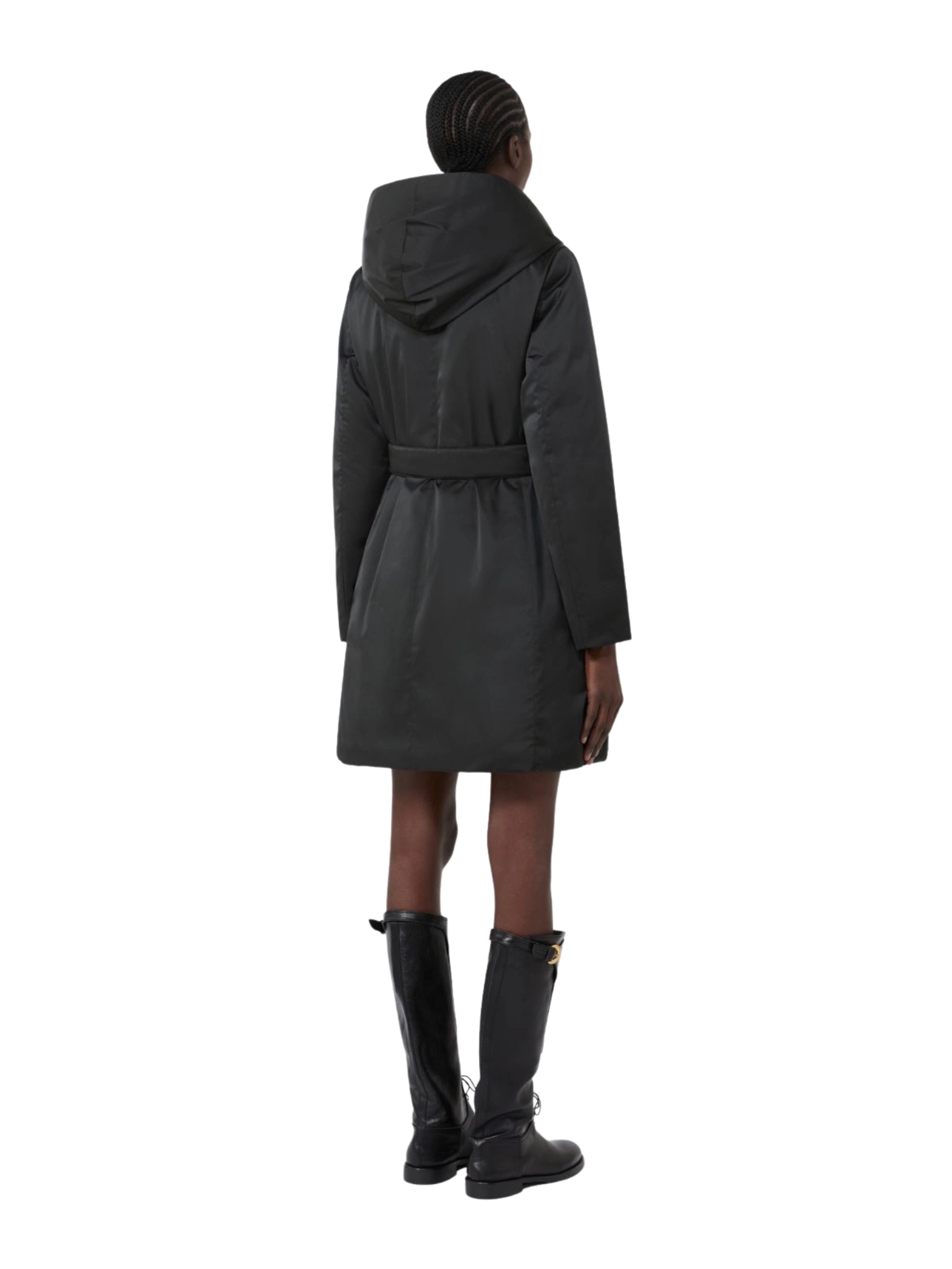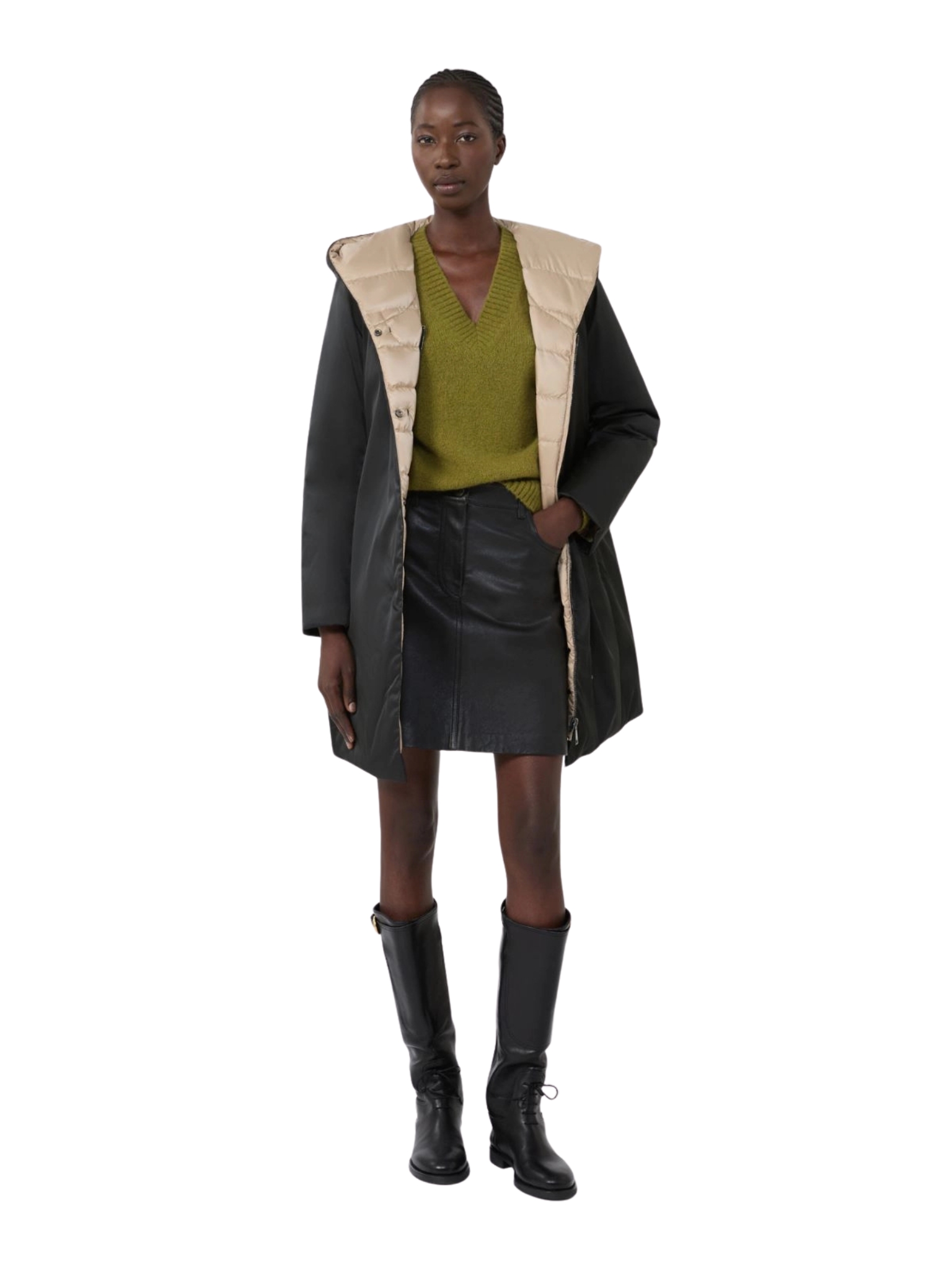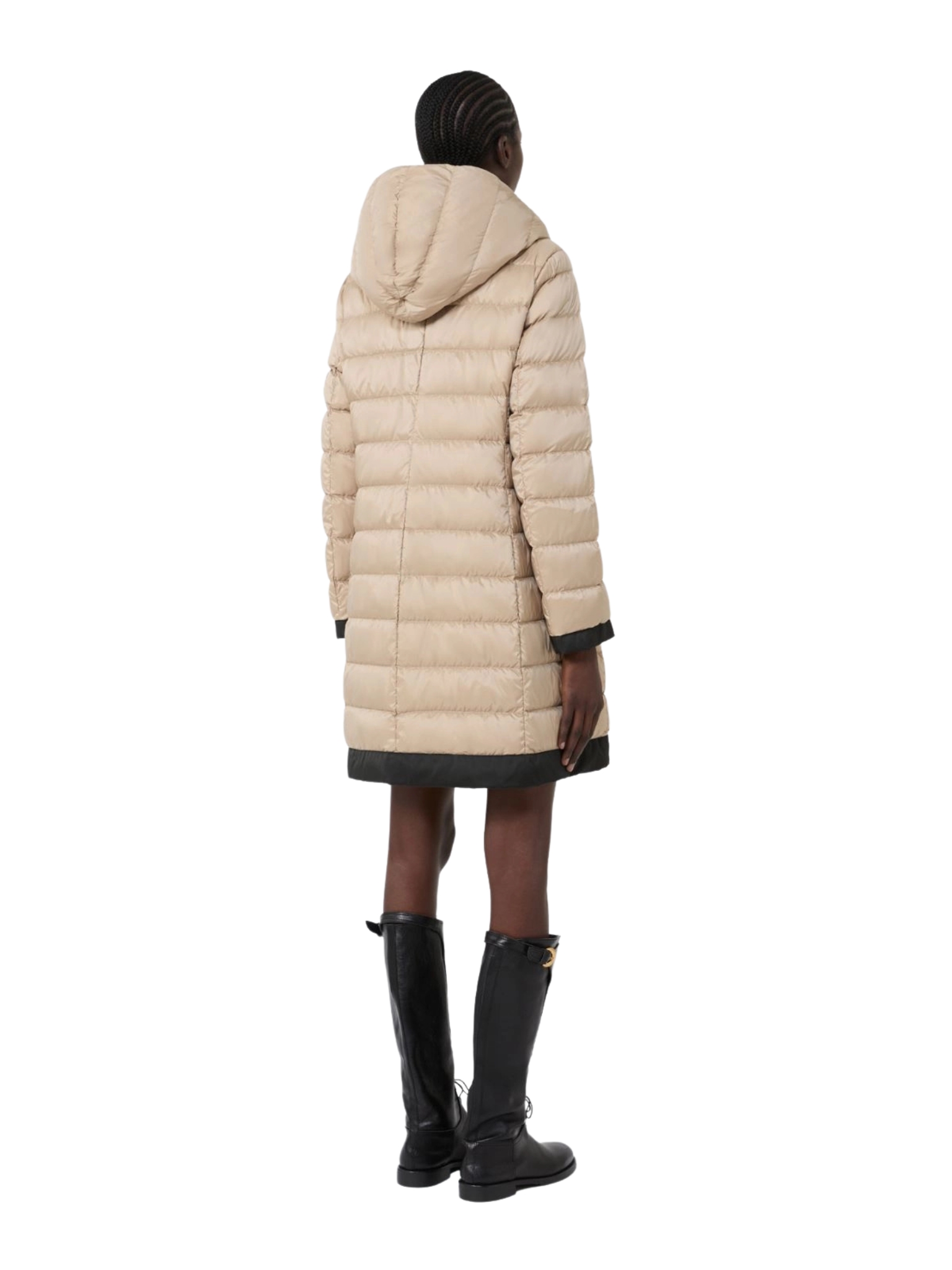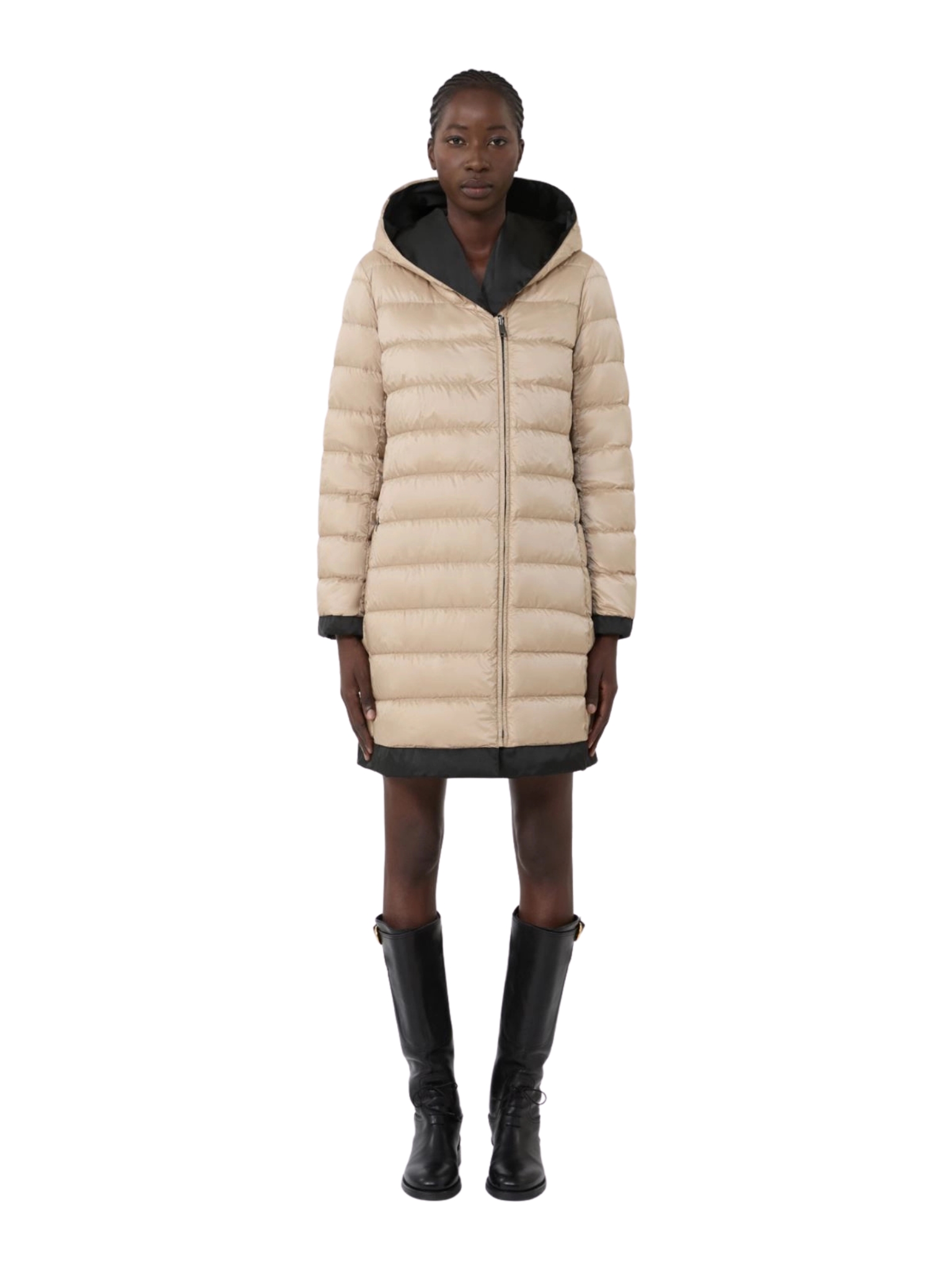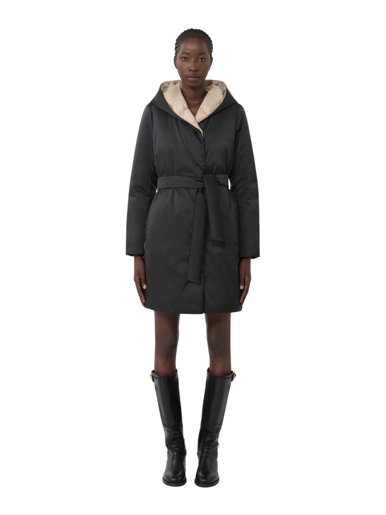 Piumino midi reversibile: un lato presenta motivo a righe orizzontali trapuntato all over, l'altro è completamente liscio. In tessuto tecnico antigoccia, Linea dritta con collo alto con cappuccio e maniche a giro. Chiusura bottoni a pressione e cintura abbinata, tasche inserite nei fianchi. Imbottito in piuma d'oca