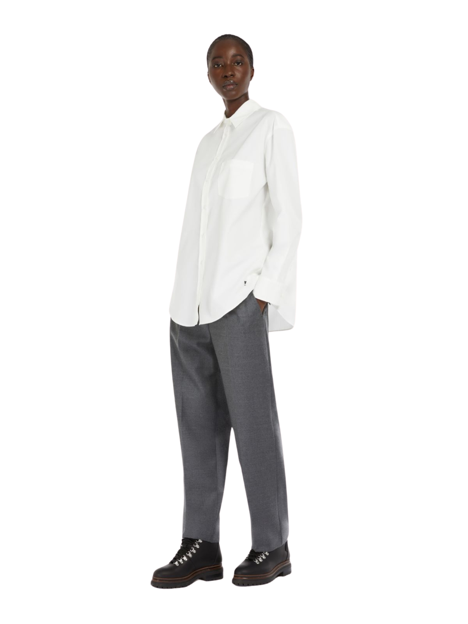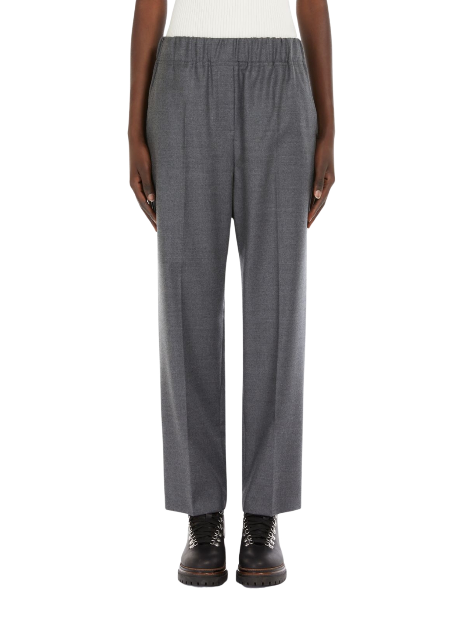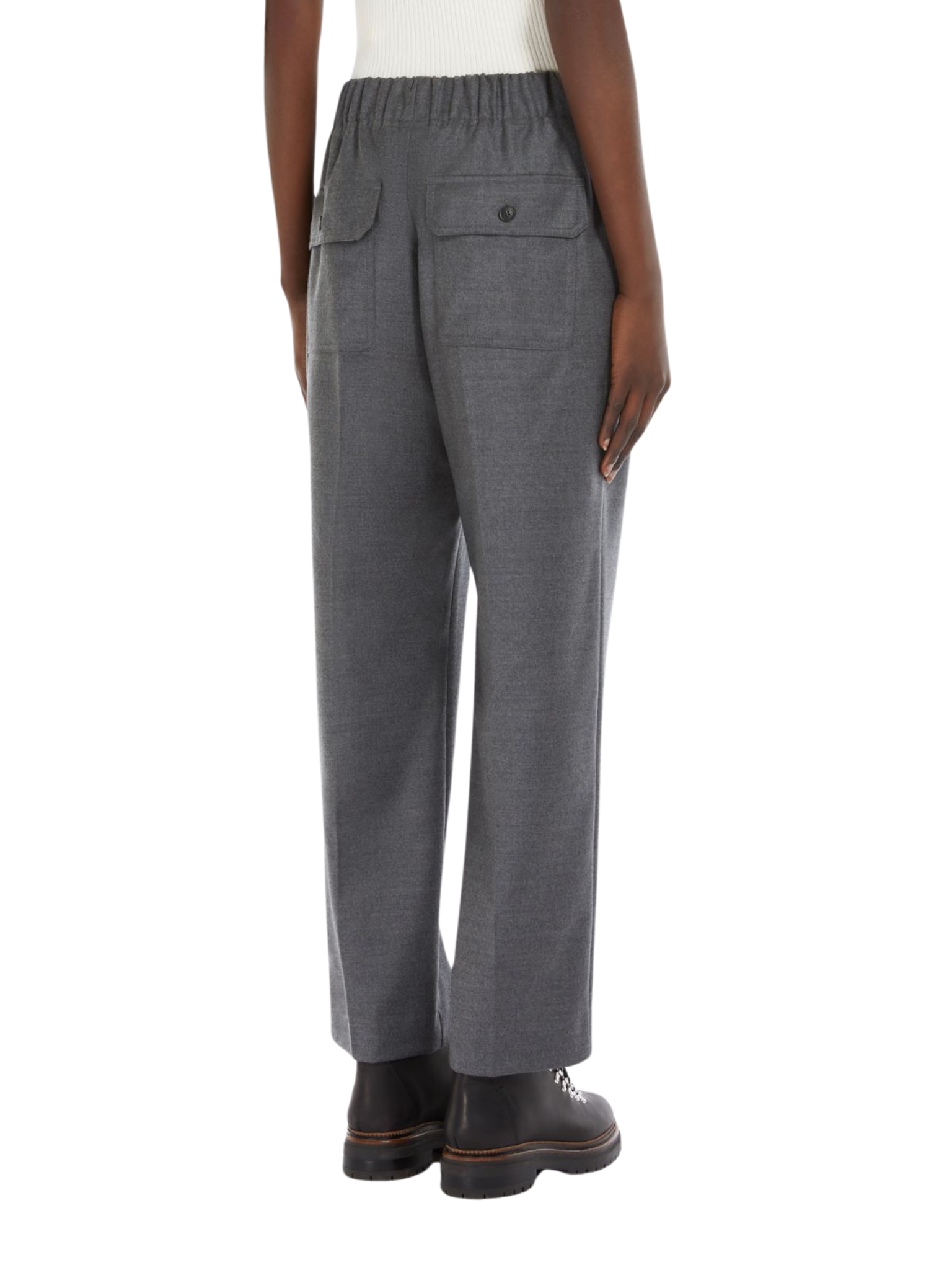 Pantalone cropped alla caviglia con vita elasticizzata, in flanella di lana stretch. Linea comoda con tasche alla francese sui fianchi e tasche a toppa con patta e bottone sul retro. Piega stirata