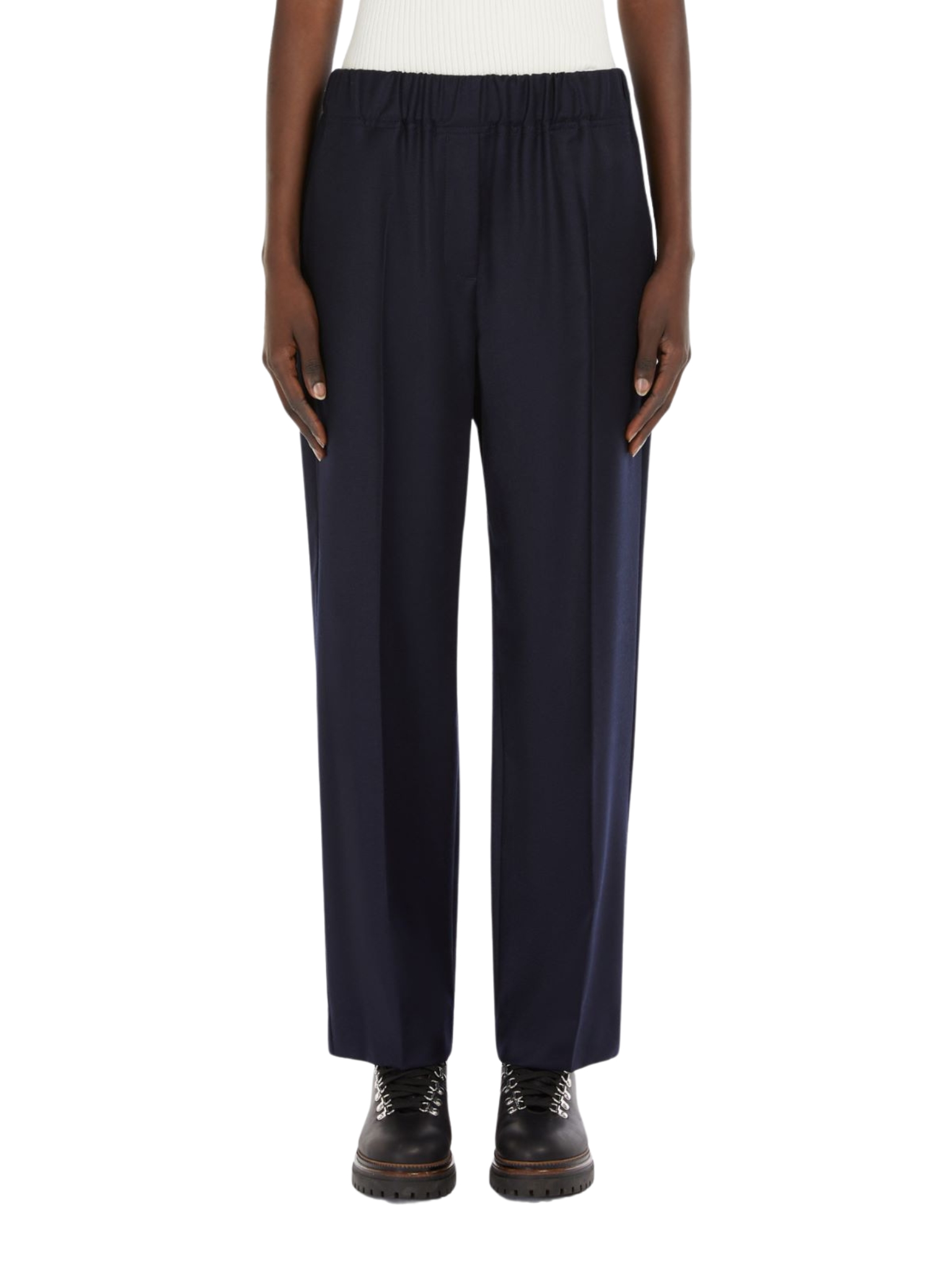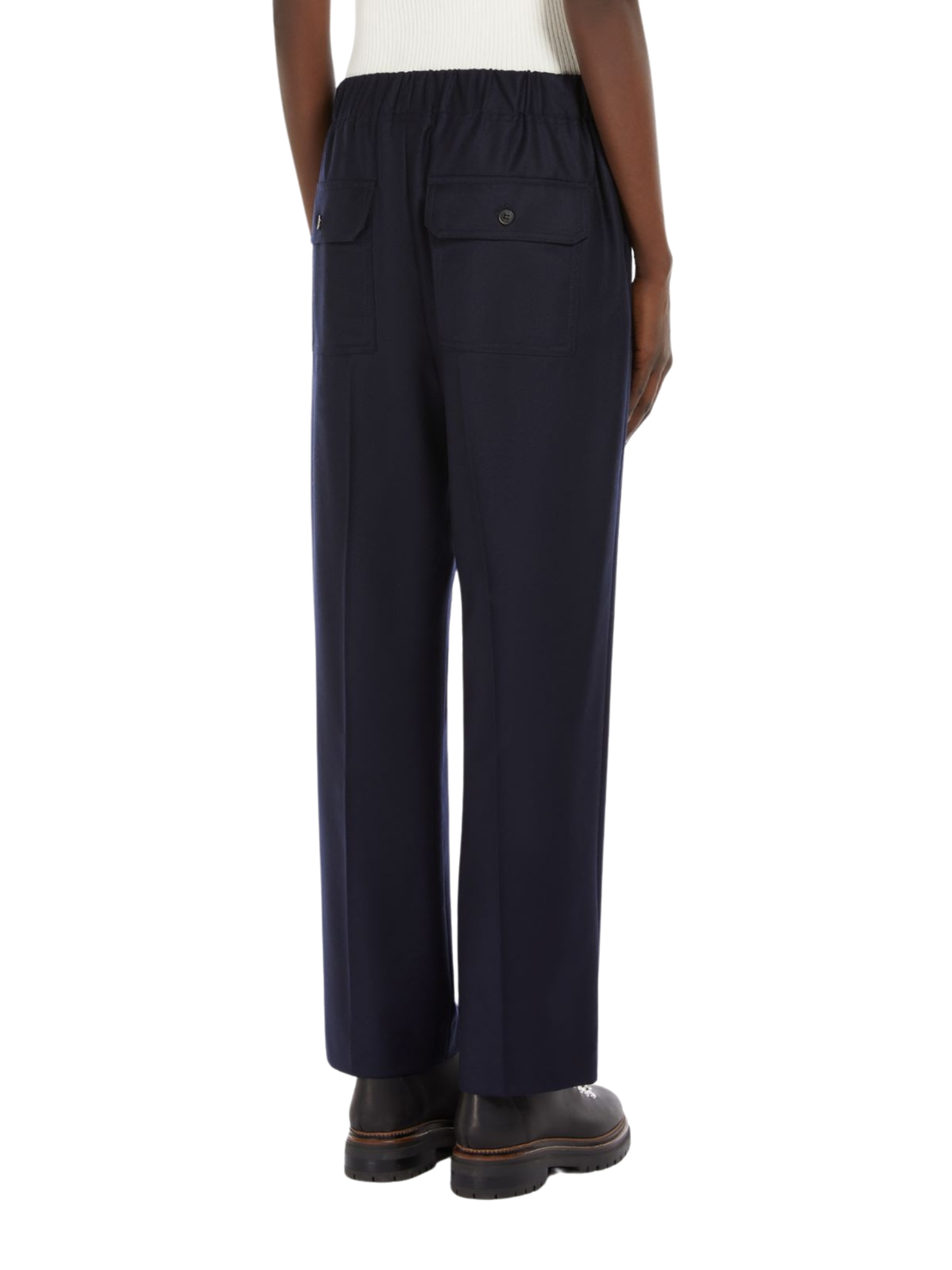 Pantalone cropped alla caviglia con vita elasticizzata, in flanella di lana stretch. Linea comoda con tasche alla francese sui fianchi e tasche a toppa con patta e bottone sul retro. Piega stirata