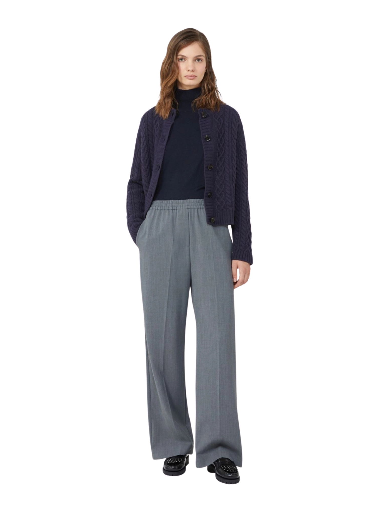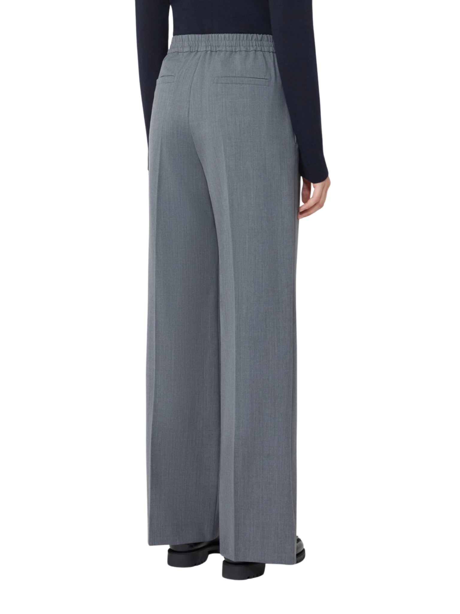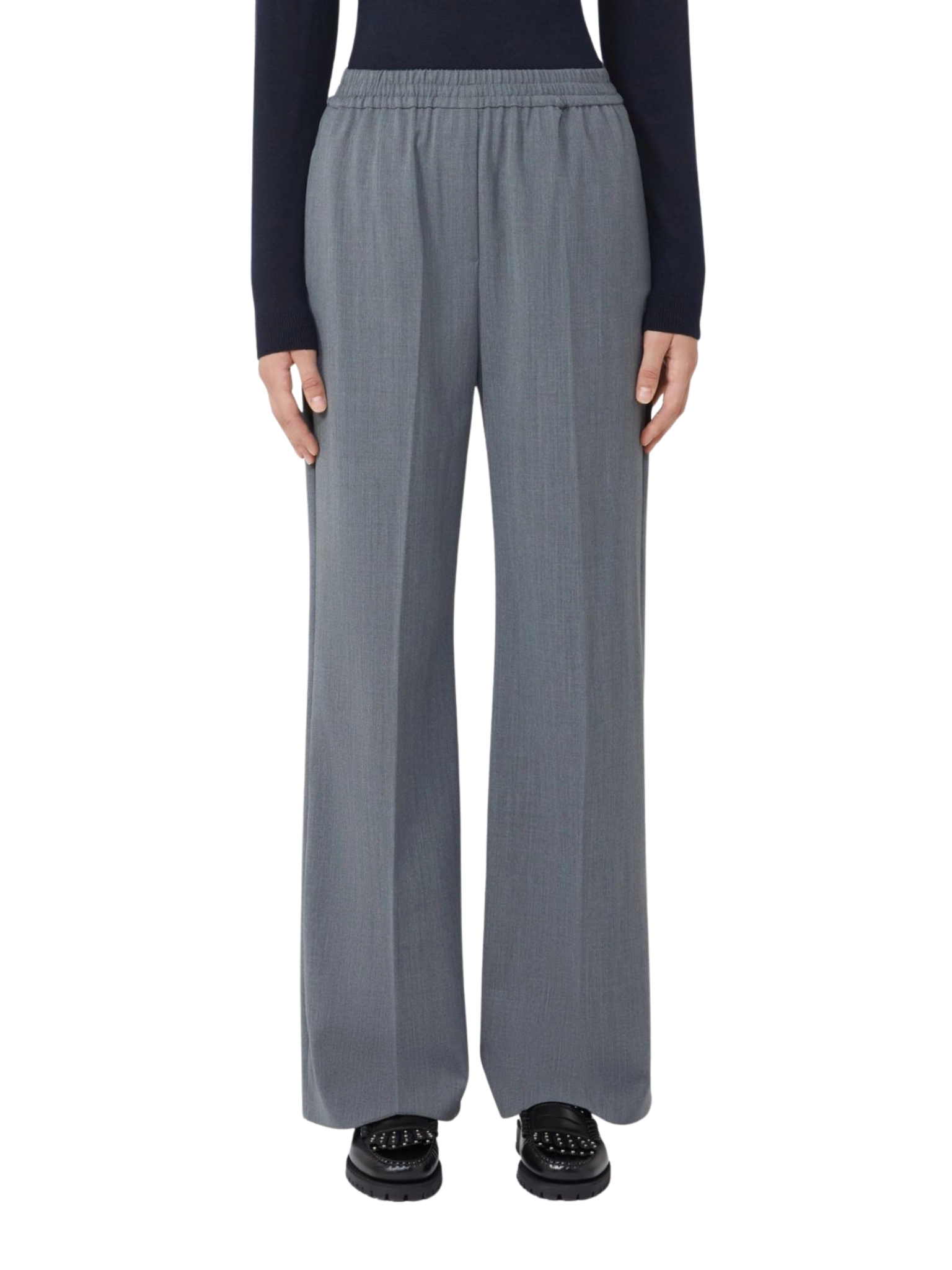 Pantalone lungo comfort fit con vita elasticizzata e coulisse regolabile interna. In gabardina di lana tecnica stretch, linea dritta. Tasche inserite nei fianchi, tasche a filetto sul retro e piega stirata